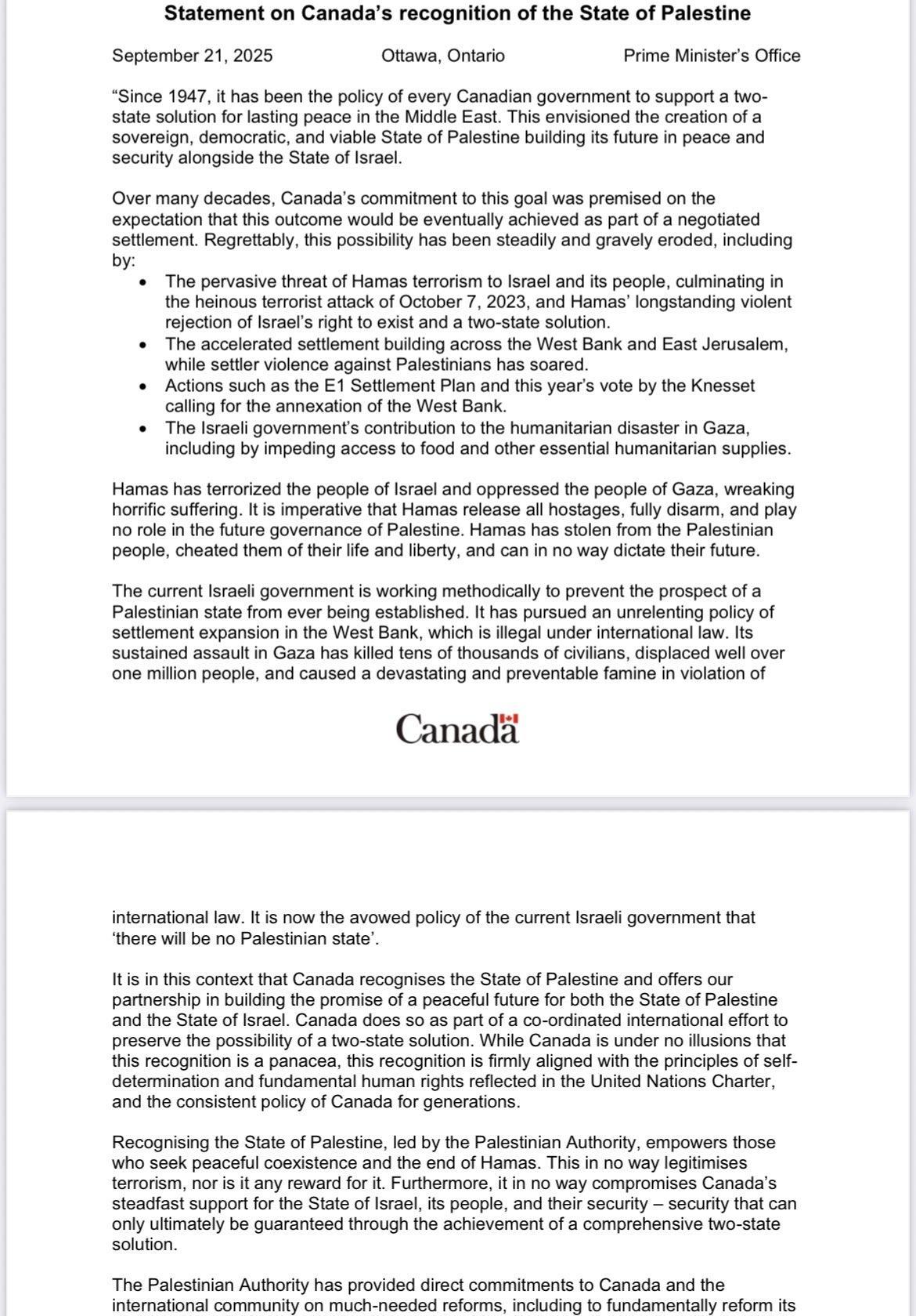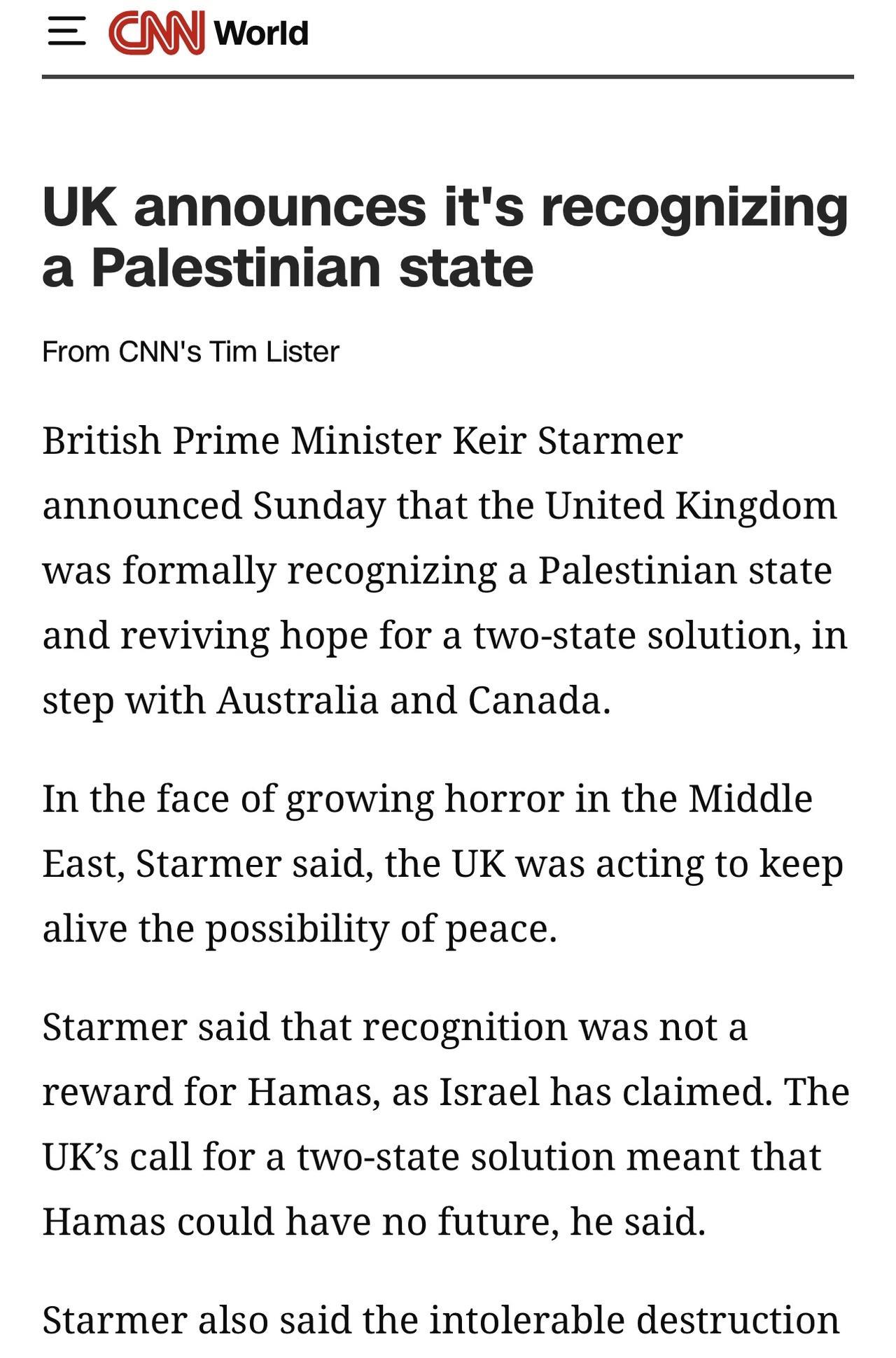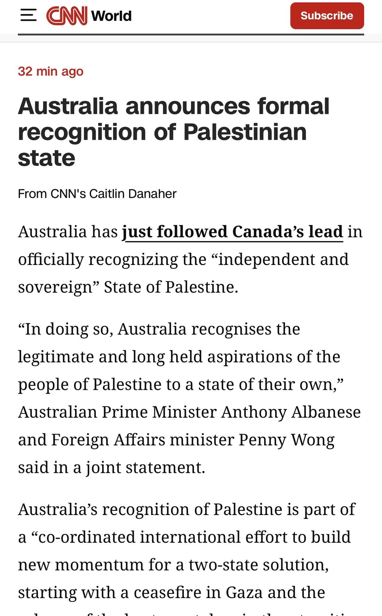 加拿大、澳大利亚、英国先后宣布正式承认巴勒斯坦国。 1.加拿大宣布承认巴勒斯坦国,这一举动预计将在今天晚些时候由英国以及法国和其他国家在本周的联合国大会上反映。 加拿大总理马克·卡尼在X的一篇文章中说:“加拿大承认巴勒斯坦国,并承诺我们的伙伴关系,为巴勒斯坦国和以色列国建立一个和平的未来。” 卡尼在7月曾表示,他的国家打算在联合国大会上承认巴勒斯坦国。 当时,该计划遭到了以色列官员的谴责,他们将该决定描绘成“对哈马斯的奖励”。 在卡尼Carney发表声明之前,加拿大高级官员反驳了以色列对该决定的负面反应,他们告诉CNN,承认巴勒斯坦“不是为了对抗或惩罚以色列”。 一位加拿大高级官员说:“我们真诚的沟通努力是解释这一点,并尽我们所能防止那些试图将此变成对抗姿态的声音赢得成功。” 加拿大官员补充说,尽管以色列公开反对建立巴勒斯坦国的前景,但他们认为承认仍是两国解决方案。 2.澳大利亚宣布正式承认巴勒斯坦国 澳大利亚刚刚跟随加拿大的领导,正式承认了“独立和主权”的巴勒斯坦国。 澳大利亚总理安东尼·阿尔巴尼斯和外交部长Penny Wong在一份联合声明中表示:“通过这样做,澳大利亚认识到巴勒斯坦人民建立自己国家的合法和长期愿望。” 声明补充说,澳大利亚对巴勒斯坦的承认是“协调的国际努力的一部分,为两国解决方案建立新的势头,从加沙停火和释放2023年10月7日暴行中劫持的人质开始”。 3.英国首相斯塔默Keir Starmer周日宣布,英国正在正式承认巴勒斯坦国,并与澳大利亚和加拿大一致,重振对两国解决方案的希望。 Starmer说,面对中东日益严重的恐怖,英国正在采取行动,以保持和平的可能性。 Starmer说,正如以色列所声称的那样,认可不是对哈马斯的奖励。他说,英国呼吁两国解决方案意味着哈马斯不可能没有未来。 Starmer还表示,加沙难以忍受的破坏必须结束。
