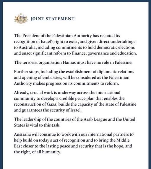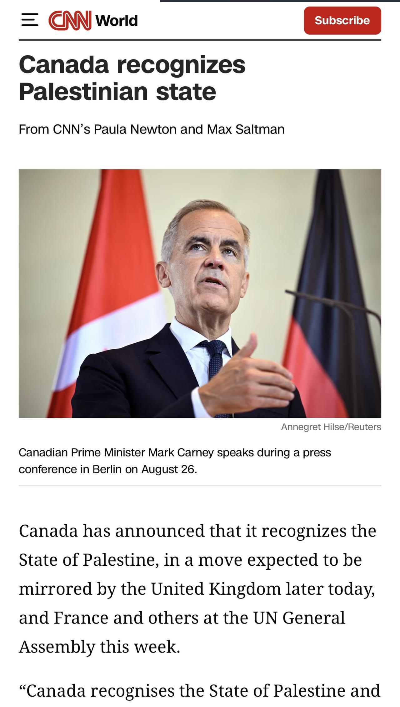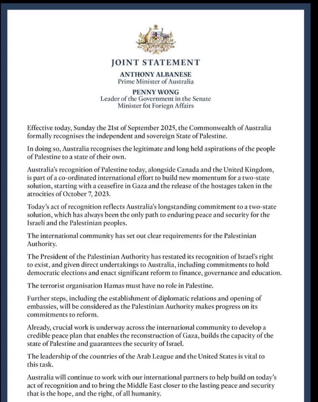 加拿大、澳大利亚、英国先后宣布正式承认巴勒斯坦国。 1.加拿大宣布承认巴勒斯坦国,这一举动预计将在今天晚些时候由英国以及法国和其他国家在本周的联合国大会上反映。 加拿大总理马克·卡尼在X的一篇文章中说:“加拿大承认巴勒斯坦国,并承诺我们的伙伴关系,为巴勒斯坦国和以色列国建立一个和平的未来。” 卡尼在7月曾表示,他的国家打算在联合国大会上承认巴勒斯坦国。 当时,该计划遭到了以色列官员的谴责,他们将该决定描绘成“对哈马斯的奖励”。 在卡尼Carney发表声明之前,加拿大高级官员反驳了以色列对该决定的负面反应,他们告诉CNN,承认巴勒斯坦“不是为了对抗或惩罚以色列”。 一位加拿大高级官员说:“我们真诚的沟通努力是解释这一点,并尽我们所能防止那些试图将此变成对抗姿态的声音赢得成功。” 加拿大官员补充说,尽管以色列公开反对建立巴勒斯坦国的前景,但他们认为承认仍是两国解决方案。 2.澳大利亚宣布正式承认巴勒斯坦国 澳大利亚刚刚跟随加拿大的领导,正式承认了“独立和主权”的巴勒斯坦国。 澳大利亚总理安东尼·阿尔巴尼斯和外交部长Penny Wong在一份联合声明中表示:“通过这样做,澳大利亚认识到巴勒斯坦人民建立自己国家的合法和长期愿望。” 声明补充说,澳大利亚对巴勒斯坦的承认是“协调的国际努力的一部分,为两国解决方案建立新的势头,从加沙停火和释放2023年10月7日暴行中劫持的人质开始”。 3.英国首相斯塔默Keir Starmer周日宣布,英国正在正式承认巴勒斯坦国,并与澳大利亚和加拿大一致,重振对两国解决方案的希望。 Starmer说,面对中东日益严重的恐怖,英国正在采取行动,以保持和平的可能性。 Starmer说,正如以色列所声称的那样,认可不是对哈马斯的奖励。他说,英国呼吁两国解决方案意味着哈马斯不可能没有未来。 Starmer还表示,加沙难以忍受的破坏必须结束。