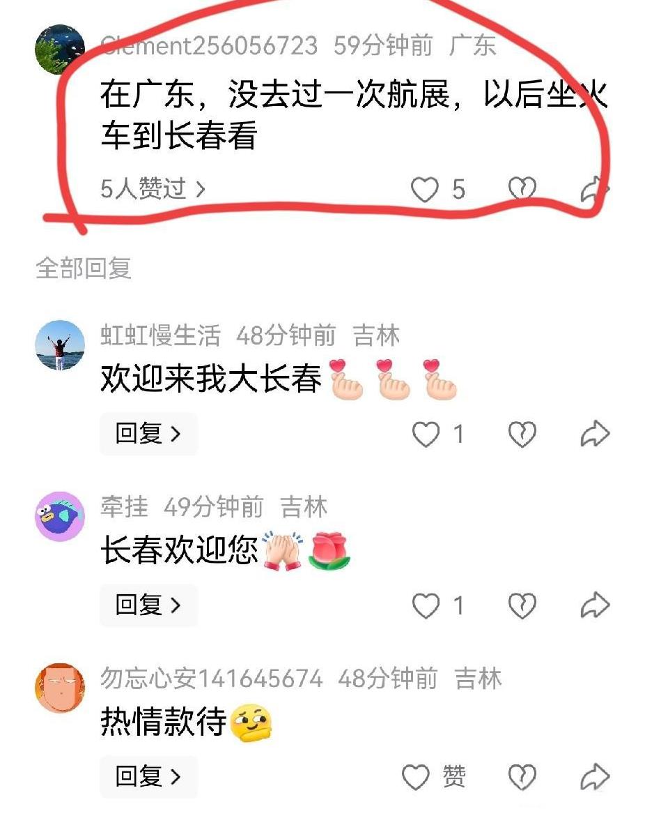 难怪广东网友说没去过一次珠海航展,以后要坐火车去长春看! 长春航展属实地道,门票免费,摆渡车排着长队接送,矿泉水1.5一瓶,午饭20多一份,基本全是市场价,里面工作人员也特给力,既热情又周到。 别的不说,长春的天气是真配合真给力,每年的航展都是蓝天白云。战机飞上蓝天,直冲云霄,让参观者大饱眼福。飞行表演完,飞行员和观众招手互动特别亲切。博览城的四个展区很有内容,有低飞区、体验区等等,飞行表演现场感觉非常震撼。即使没有抢到门票,坐在门外的蓝天公园观看表演效果也不错。 给我感受最深的是长春人的热情,热情到让你不好意思。你要是问个路,如果不是太远能给你送到地方。另外,长春的吃住真的不贵,只要是来参展的人都能消费的起。品尝了东北烧烤、炖菜、江鱼,那真不是吹的,好吃,管饱,还得打包! 每年航展都是长春乃至东北最好的季节,来长春看完航展顺便溜达一下大美东北,爽歪歪!那么近那么美,欢迎来东北溜达溜达! [太阳][彩虹][给力]