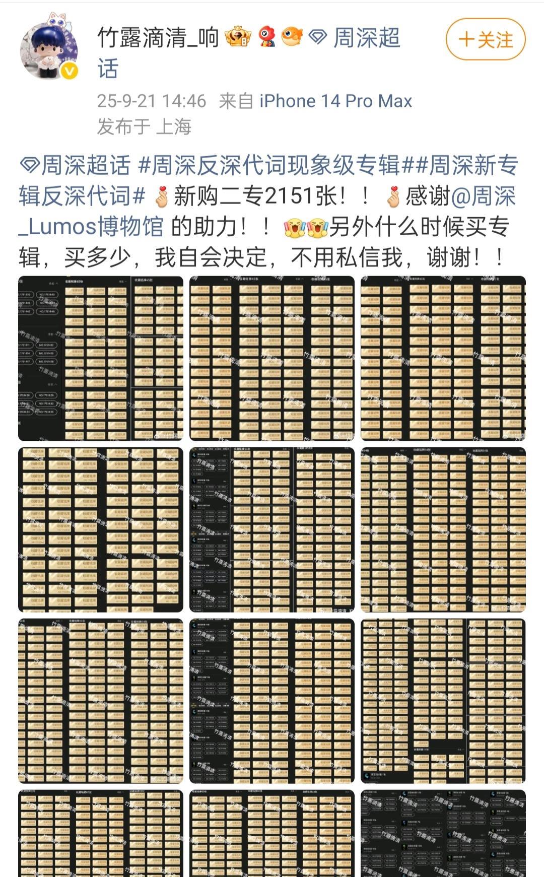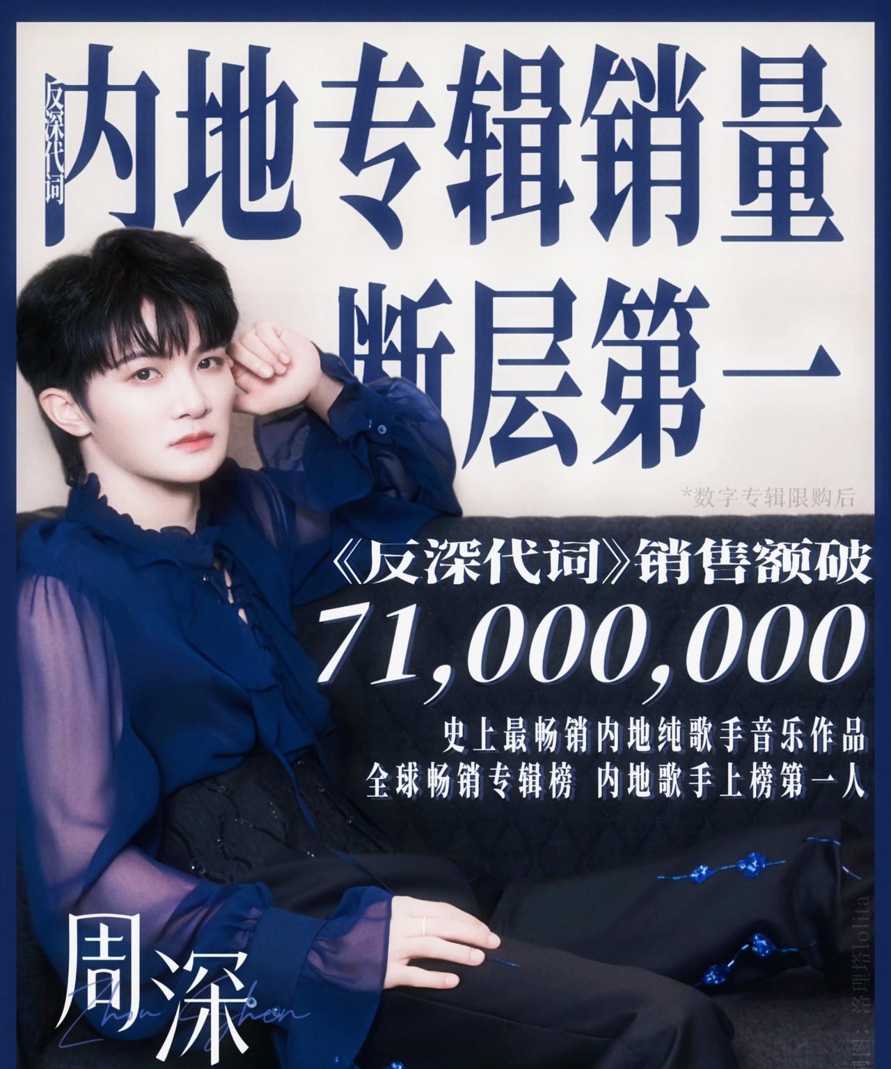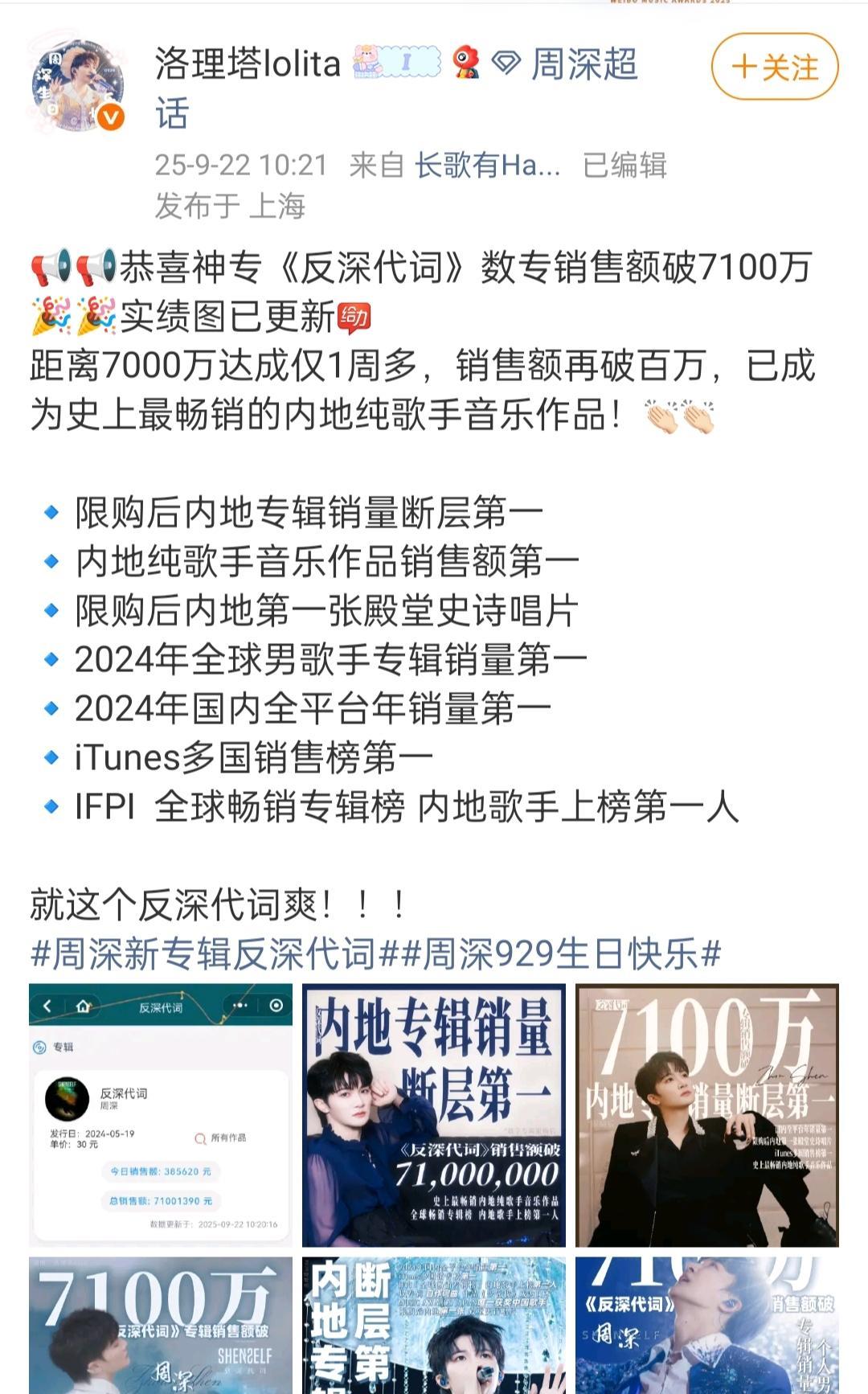 神专《反深代词》整专发布不到一年,就冲上了数字专辑排行榜总的第五位了! 第一首歌《蜃楼》是2024年3月31日上线,9月29日整专完整发行,到今天不到一年! 这是米子们给周深929的生日礼物! #周深#