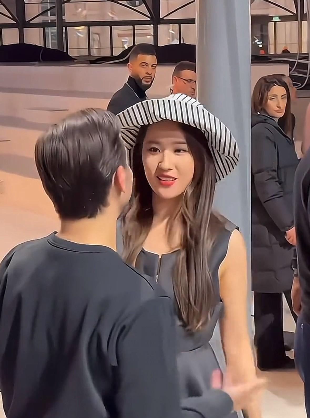 刘亦菲在巴黎时装周又杀疯了! 一身黑色无袖收腰裙装+黑白条纹宽檐帽,把甜妹感和摩
