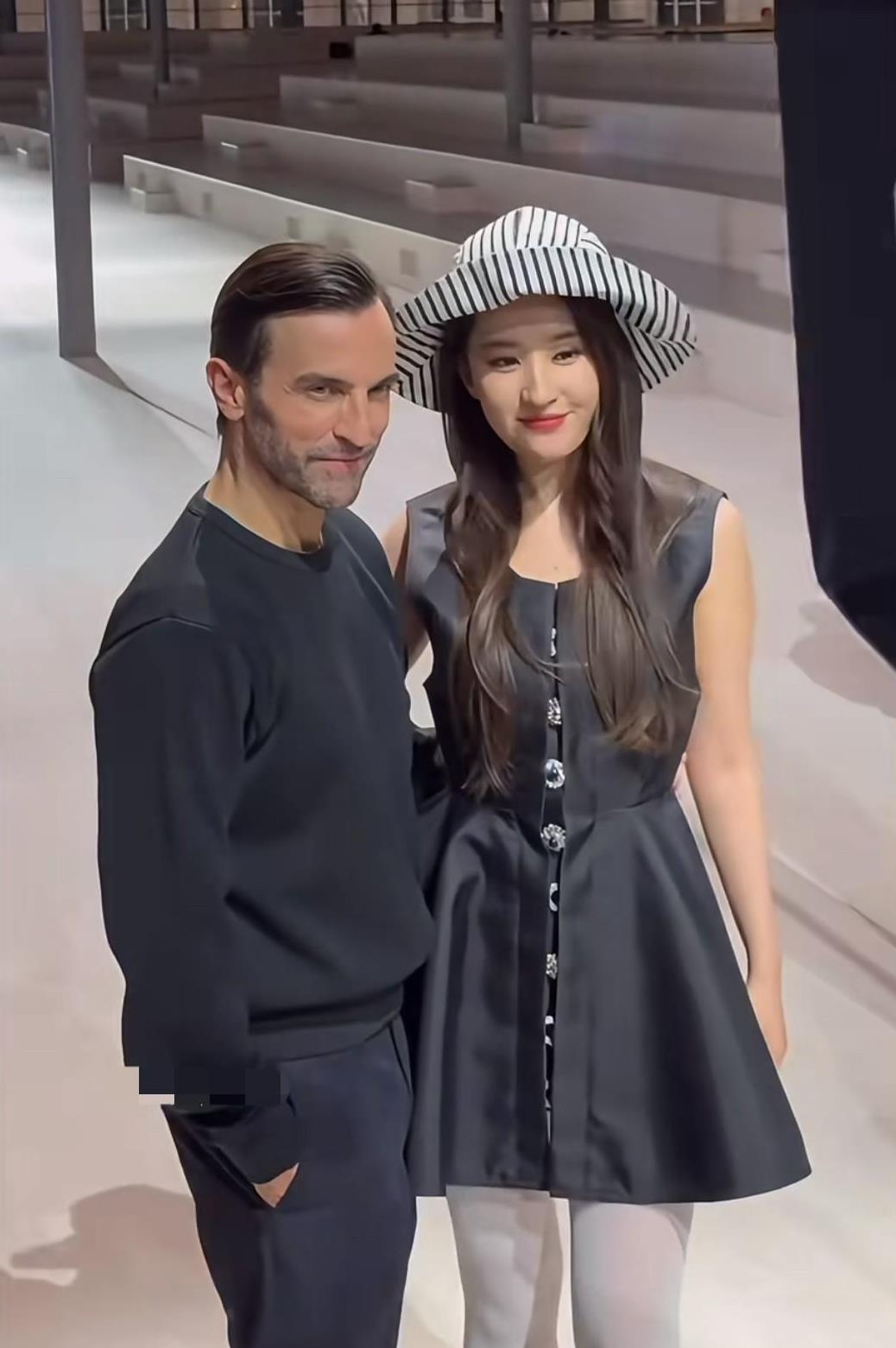 刘亦菲在巴黎时装周又杀疯了! 一身黑色无袖收腰裙装+黑白条纹宽檐帽,把甜妹感和摩登范儿揉在一起,站在LV女装创意总监尼古拉·盖斯奇埃尔身边气场全开,在秀场一众造型里一眼就能锁定她。作为LV全球代言人,在国际秀场稳站C位真不是吹的!#刘亦菲#