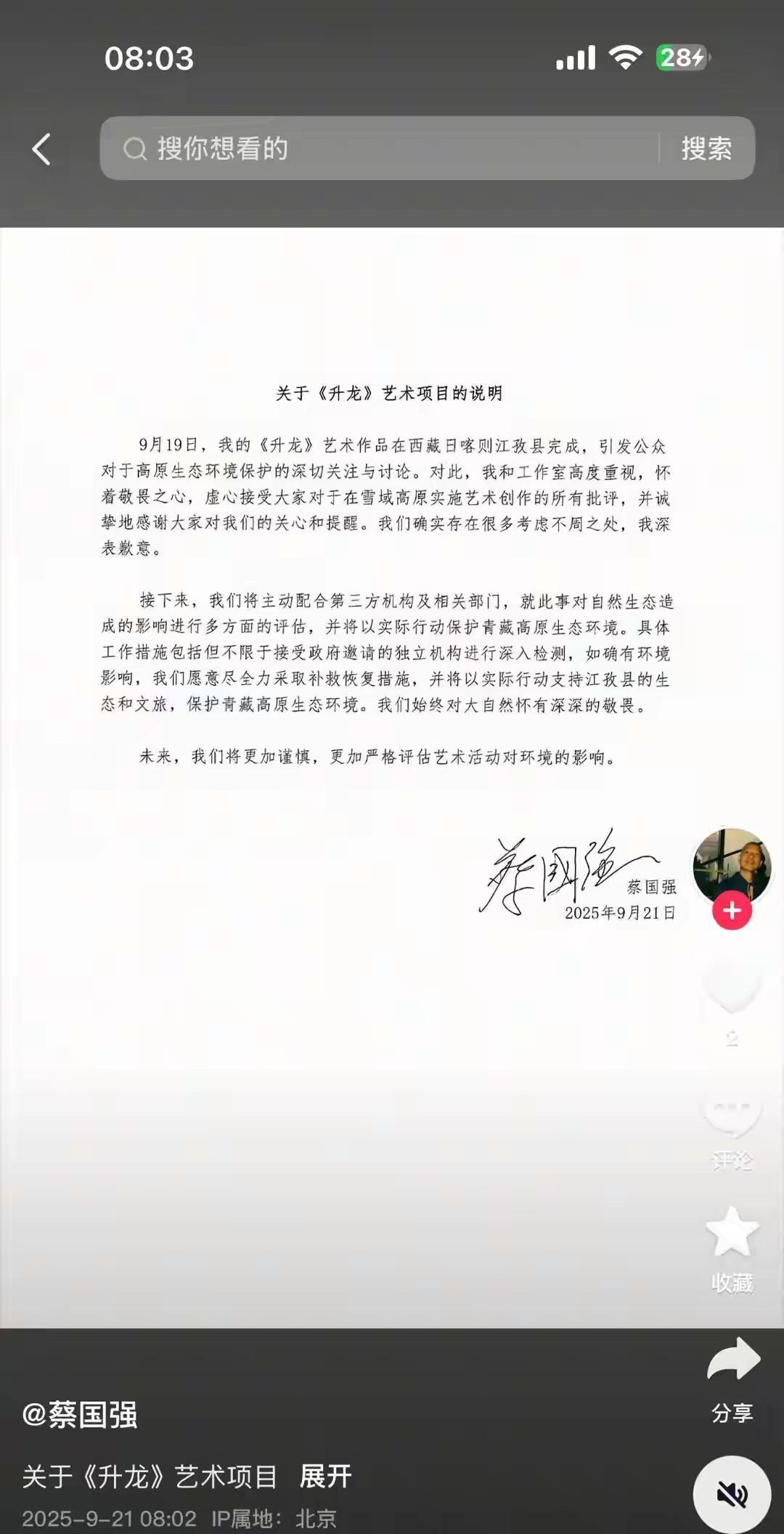 蔡国强致歉,我很难同意。9月19号晚,他和始祖鸟在海拔5500米的西藏日喀则喜马拉雅山脉附近搞《升龙》烟花表演。虽主办方称烟花材料环保可降解、污染物达标,但现场炸完后黑烟滚滚,浓烟久久不散。 有专家指出,翻土难修复高原草甸植被,恢复可能要上百年,且烟花会惊扰小动物。9月21号蔡国强和始祖鸟致歉,可网友根本不买账,这就是压不住事儿了才出来道歉。前有环卫老人阻止游客放彩烟被群殴,他们却明目张胆放烟花,这样的行为难以原谅。