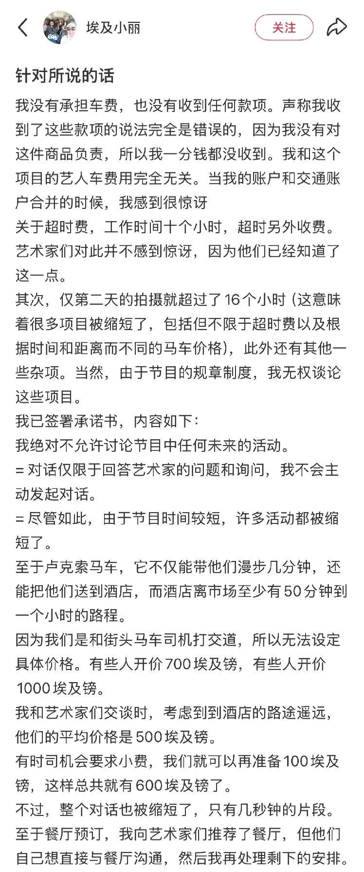 《花少7》在埃及被熟人宰客后,地陪小丽的回应阴阳味儿太重了! 她的回应里,一直都称那英一行人为“艺术家”,这个词看似没问题,以前都是拿来夸人的,但用在一群明星身上,就显得很讽刺了,只会引起网友们的吐槽! 而且她说车费贵和她无关,她只是一个地陪,但是她这个地陪在节目里没有起到任何作用,更像是一个包车中间人,她负责的只有车子的事项,没有主动给那英等人介绍埃及的风土人情。 她对话少的解释是,节目组有规定,她只能在“艺术家”们问她问题的时候,她才回答,这个规定太奇怪了,以前花少去其他国家找的地陪也不是这样的啊。 这个小丽给人的感觉就是冷漠,事不关己,根本就不专业,而这样的地陪是花少5的熟人马哥推荐的,感觉这就是一场针对人傻钱多的节目组和明星们设的熟人宰客局!