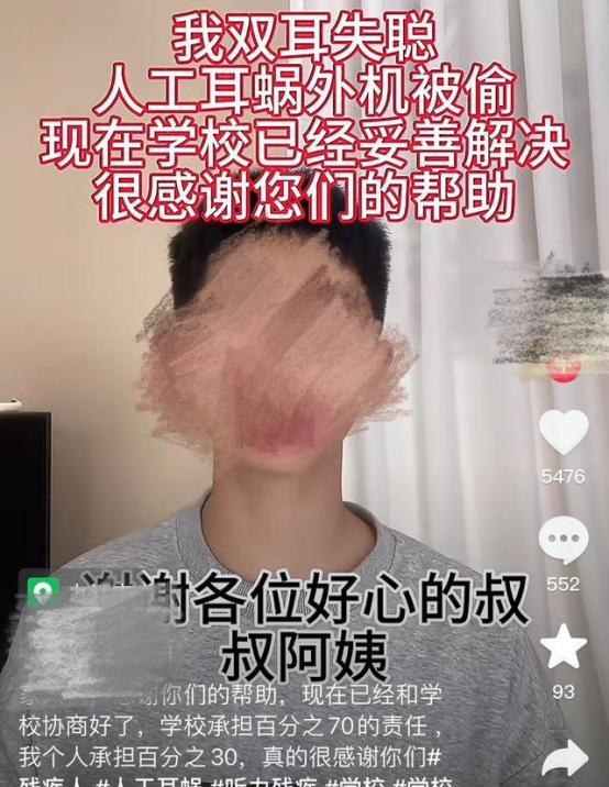 恶作剧还是有仇!江西九江双耳失聪男生早上洗漱时,放在宿舍内的人工耳蜗丢失,37天也没找回,只能休学在家,男孩崩溃:一直处在无声的世界。 九江中学初三听障男孩怎么也不会想到,就在自己洗漱的短短几分钟内,他放在床头的人工耳蜗不翼而飞了,而这个小小的设备,是他与这个有声世界的唯一连接。 事发当天,男孩将维系他听觉的人工耳蜗放在宿舍充电,十分钟洗漱完后,准备回来佩戴,结果却再也没能找到。 虽然这个小小的外机只花费6万余元,但是手术费、康复费等各项费用总和已经高达60多万,对于普通家庭来说,真的不是一笔小数目。 可校方最初的应对简直令人愕然,既没有立即报警,也没有紧急排查,甚至都没第一时间通知男孩家长。这种迟钝的反应,直接错过了寻找的黄金时间。 事件曝光后,舆论哗然。人们无法理解,在一个住满学生的封闭空间内,为何连如此贵重的医疗设备都无法得到安全保障? 而后37天过去了,那个比硬币略大的精密仪器始终杳无音信。男孩只能被迫休学回家,彻底生活在无声的寂静中。男孩的母亲看着儿子崩溃自责地捶打自己的耳朵,更是绝望到说不出话。 这起案件之所以令人关注,是因为这种事竟然发生在一所初中校园里,这让我们不得不质疑:学校在这起事件中是否尽到了应有的责任? 首先,从孩子耳蜗丢失后,老师既没有第一时间通知家长,也没有对现场进行有效的保护,这无疑给后续的调查增加了难度。 学校作为学生的第二监护人,本应对学生的安全和财物负有一定的监管责任,可在这起事件中,学校的表现却让人失望。 其次,对于人工耳蜗这样的贵重物品,无论是学校还是家长,都应该意识到其重要性。在学校里,可以设置专门的保管区域,为学生提供安全稳妥的保管位置。 此外,这起事件也让我们看到了社会对特殊群体的关注还远远不够。一个人工耳蜗丢失,足以让一个失聪孩子的人生轨迹发生改变。 回顾这起事件,责任链条足够清晰。拖延报警、缺乏排查手段、没有后续支持......种种迹象都在控诉着学校存在明显的安全漏洞。 信息来源: 百度百科|《9·11九江男孩丢失人工耳蜗事件》 生活帮|《初三男孩人工耳蜗在宿舍丢失 家长:花费近60万元 无能力再配 学校:配合警方在处理》 中华网新闻|《初三男生近60万人工耳蜗宿舍内丢失,“没有能力再配新的”:无声世界里的绝望呼救》 文|墨海 编辑|史叔