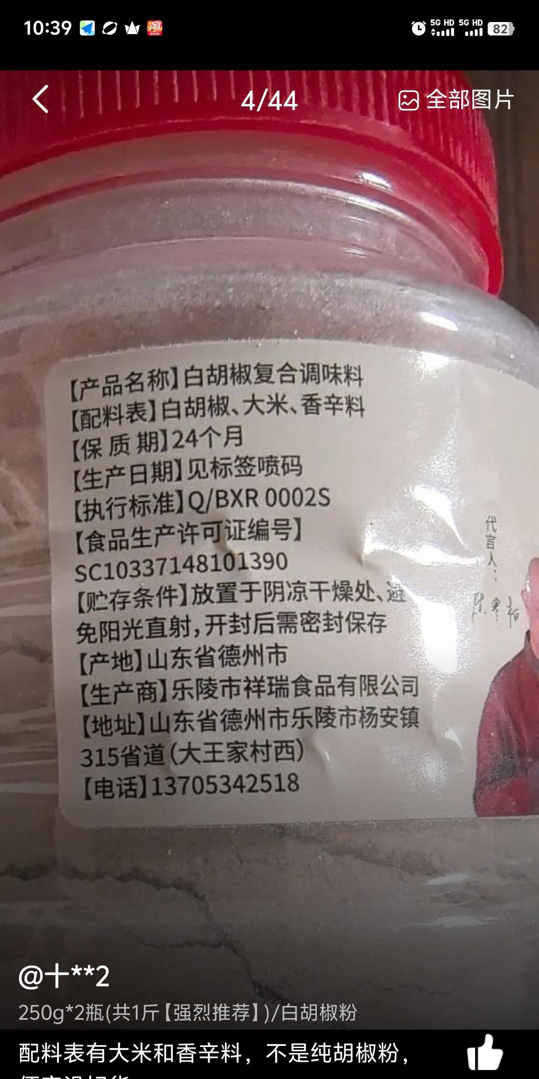 这个胡椒粉千万别买,配料表是胡椒粉、大米、香辛料,一看就是假的,里面掺的有其他东西。 我们店里用的正儿八经胡椒粉一百块钱一斤,这么便宜咋可能是真正的胡椒粉,这不就是光明正大的骗人吗,平台也不管不问,你要这样的话我都想加入骗子了。