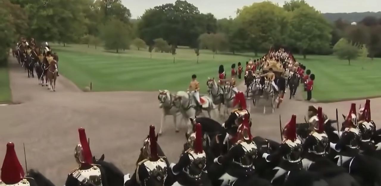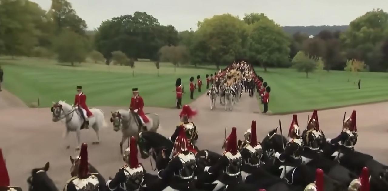 特朗普在庞大的骑兵礼仪队护送下,乘坐着镶着黄金的豪华马车,浩浩荡荡地进入温莎城堡