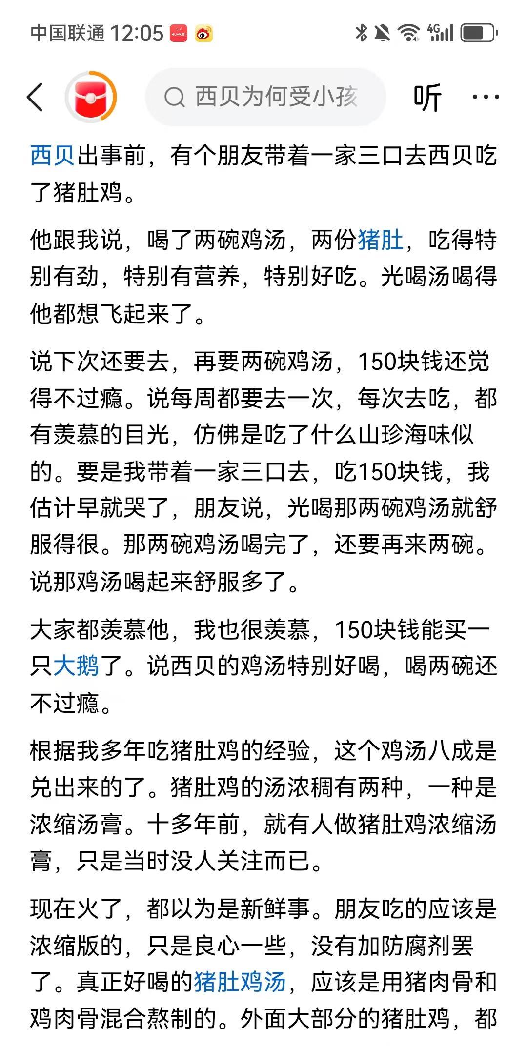 我也做菜,手艺还可以。做过不少次鸡汤鱼汤,微鲜是可以的。想鲜得不得了,不放味精鸡精是不可能的。 真正的猪肚鸡汤,香味是上好胡椒粒用刀拍碎,和猪肚,鸡一齐熬出来的。 我10年在深圳的霸王农庄打荷,那个汤是真正用大骨和鸡熬出来的,早上开始放料进去熬到下午,又浓又白。 以前还傻呼呼的用大筒骨想熬白色的浓汤,肉都熬烂了还是清的后面才知道人家是放的科技粉。 家里熬鸡汤,反正也就那样了!有次在朋友家喝鸡汤,那个鲜美,喝完嘴巴不干。我问她咋熬的?她说加了一种叫金汤佛跳墙的高汤,但可能比一滴香要好。 以前朋友一直叫买一种调料说一放汤好喝的,我想鸡精什么都尽可能的少放或不放那种东西能放,一直没买。 熬鸡汤首先鸡的品种最重要,其次用山泉水和优质盐。 这说明大家的嘴并不能分辨出好坏,只能证明去了西贝,到了那种消费水平而带来的虚荣心。 猪肚鸡的汤是调和出来了的,会做饭的都知道,用鸡肉和猪肚怎么熬,都不是会是饭馆里那样的汤,如果不想吃出病,还是少吃为好。