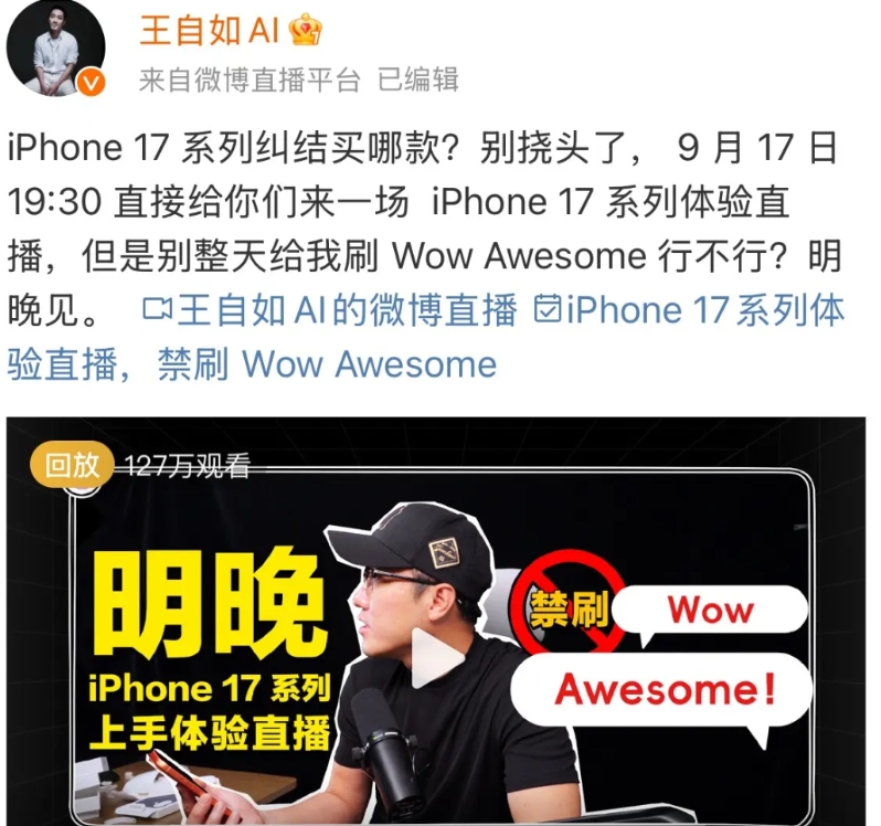 王自如说好了在AI领域二次创业,但最近几天一直在吃iPhone17系列的流量,
