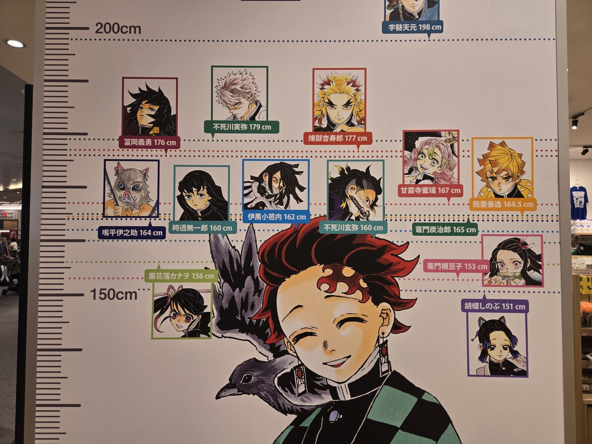 《鬼灭之刃 无限城篇》中,胡蝶忍对上童磨,因为自己的矮小的身材,没办法像是其他人一起有足够的力气挥刀斩鬼而吃了不少亏,因此胡蝶忍的身高和体重也成为许多粉丝讨论的话题。而最近日本 JUMP SHOP ららぽー之福冈店,在店内贴出了一张《鬼灭之刃》中各个角色的身高对比图,详细列出了“鬼杀队”九柱以及主角团成员们的身高,还巧妙地将漫画中未明确标示身高的角色,根据他们的形象与其他角色的对比,进行了合理的推算,满足了粉丝们的好奇心。 从这张身高图表中可以发现,全剧中身材最矮小的角色的确就是胡蝶忍,身高仅有151厘米,难怪她自己很在意。而身材最高大的角色则是岩柱悲鸣屿行冥,达到了惊人的220厘米,是剧中唯一突破2米身高的人,第二高的则是198厘米的音柱宇髓天元。主角团中,灶门炭治郎的身高是165厘米,柱以外最高的男性。