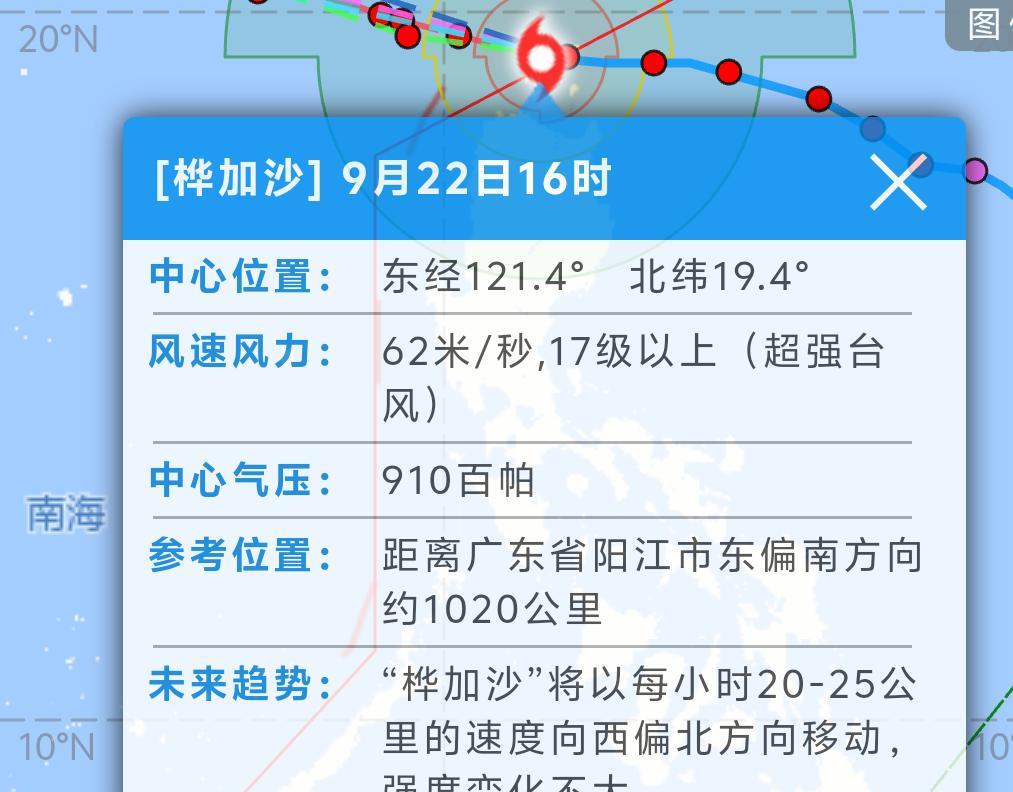 超强台风真的快要来了,今天的卫星云图上来看,广东境内云量较少,天气晴好。 不过今年第18号台风,“桦加沙”已经在位于菲律宾北部海域了。 “桦加沙”不仅实力强,而且范围也比较大,外域环流不仅影响到了台湾一带,甚至连菲律宾、南海一带都有它的影响。 卫星云图上 台风“桦加沙”风眼清晰可见,今天下午4点钟, 台风“桦加沙”中心附近最大风力,依然是17级。超强台风级别。 根据今天下午的最新数值预报来看,台风“桦加沙”将在24号向阳江到江门一带沿海靠近。