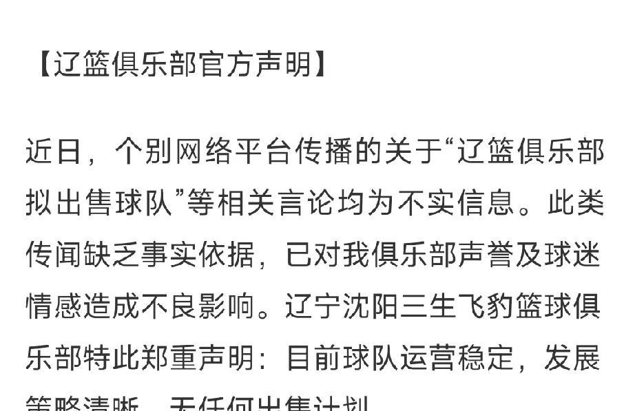 辽宁男篮官方发布声明,关于球队出售言论! 此前,很多消息称辽宁男篮俱乐部经营不善