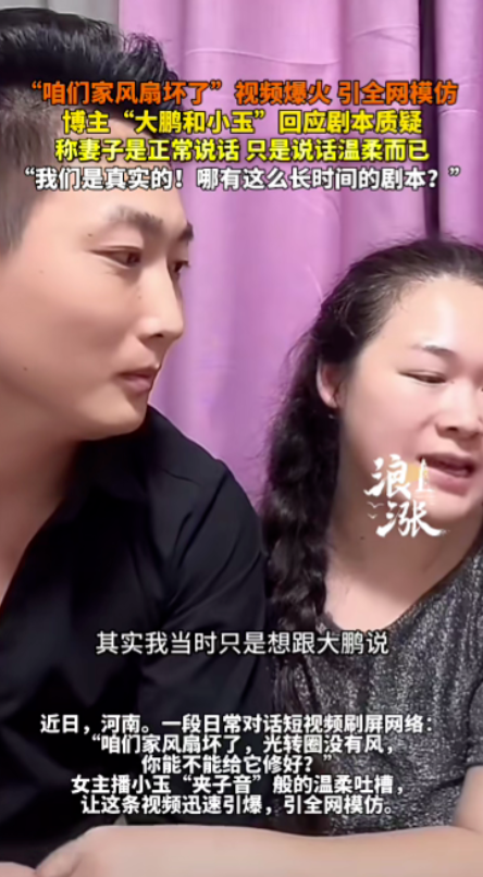 “咱们家风扇坏了”当事人婚后2天直播带货,其粉丝量已超70万,此前否认摆拍炒作 9月22日,“咱们家风扇坏了”当事人大鹏和小玉开启直播带货,直播间超3万人,其账号粉丝量已超70万。 据悉,9月20日,大鹏和小玉在出租屋举办了婚礼。9月21日,两人就赶往杭州,22日两人开启直播带货。 22日上午,大鹏和小玉账号更新。小玉称马上开播了自己很紧张,“咱们啥都不会,我就感觉害怕,给大家带来麻烦。”她表示,老怕自己做不好,昨天晚上也没怎么睡觉。其老公安慰道:“我们都是在尝试,做得好就做,做不好就回家去。” 在其账号主页显示,商品橱窗有129件好物,跟买人数3225,已售件数3480。 近日,一段日常对话短视频刷屏网络,女主播“夹子音”般的温柔撒娇说:“咱们家风扇坏了,光转圈没有风,你能不能把它修好?”如此说话,让这条视频走红,引众多网友模仿,“风扇坏了”也成了一个网络热梗。 有网友调侃,一夜之间,全网的风扇都坏了,大家模仿的很开心。 而随着“风扇坏了”夹子音的走红,质疑当事人摆拍、炒作、起号等声音也传了出来。 对此,当事人直播回应,他们是真实的,哪有这么长时间的剧本?男方还称,妻子是正常说话,只是说话温柔而已。 来源:九派新闻综合海报新闻、青岛新闻网 报料、维权通道:应用市场下载“晨视频”客户端,搜索“报料”一键直达;或拨打热线0731-85571188。如需内容合作,请拨打政企服务专席19176699651。