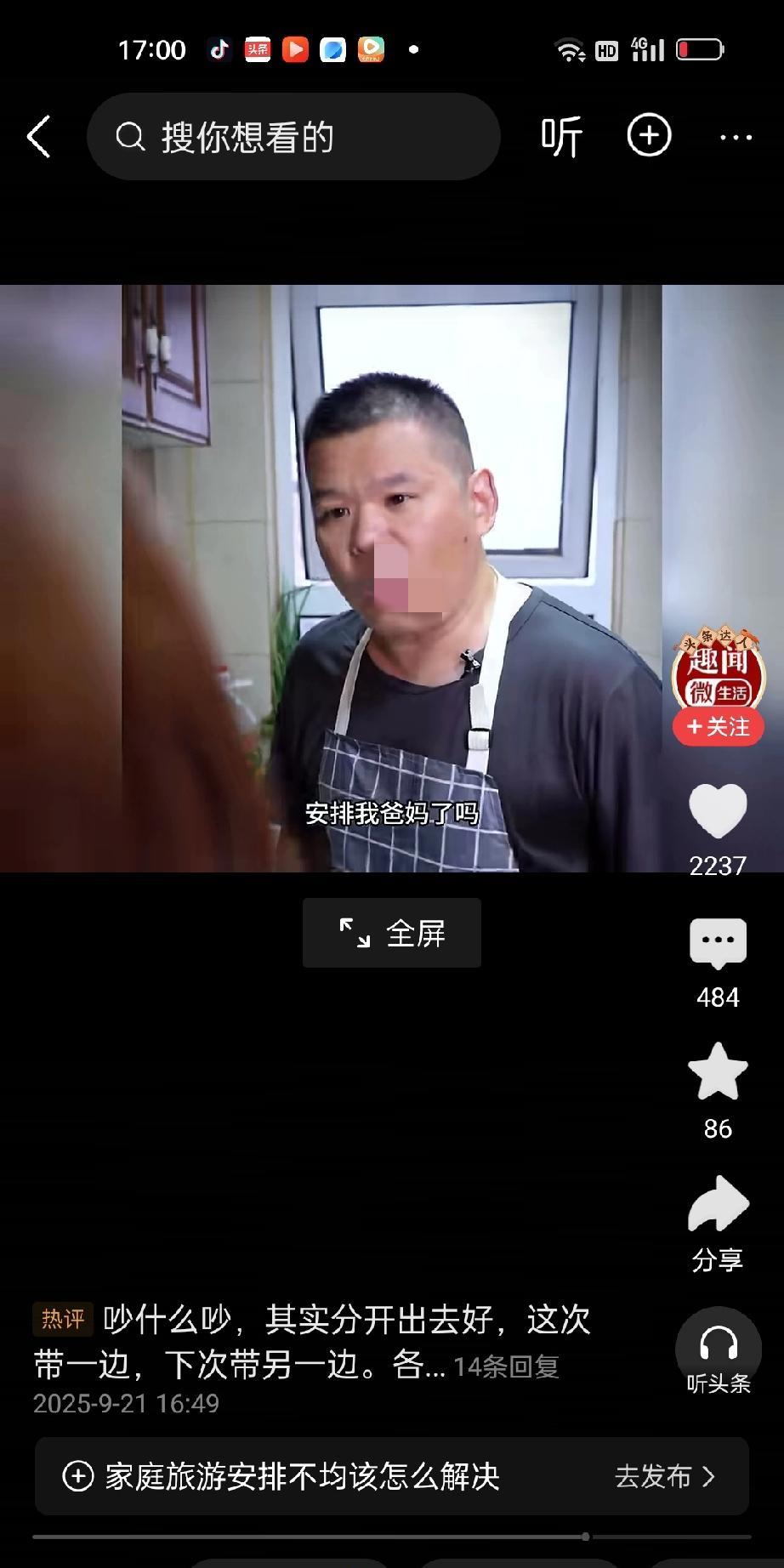 妻子跟厨房忙着的老公说,你爸妈不去了,我们订个5座的车就可以了。老公直接发飙,你干嘛提前问我爸妈?直接订个7座的车就行了。他们不是不想去,是为了给我们省钱。你为什么要给他们提前打电话问这个事情?你怎么不提前问你爸妈?老婆说,关我啥事,是你爸妈不想去。老公更来气了,你不能一碗水端平,那大家都别去了。