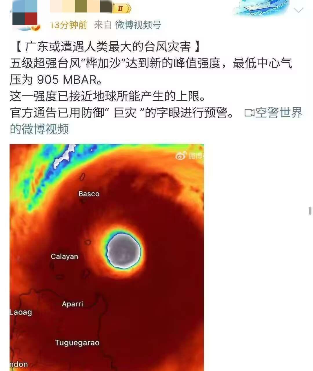 关于超强台风“桦加沙”,随着热度的升高,部分营销号开始搞大新闻,开始张冠李戴式造谣或者无限夸大: 1、图一的这张图是2018年台风“山竹”的,并不是现在的台风“桦加沙”,台风“桦加沙”在菲律宾以东洋面的位置没有那么南。 2、图三这种就是喜欢夸大,但是夸大又夸不对,台风“桦加沙”中心气压实际是有900百帕以下,但这气压算不上地球极限,1979年台风“泰培”实测过870百帕的气压。以及,当前广东防范有序,不会也不可能出现人类史上最大台风灾害。