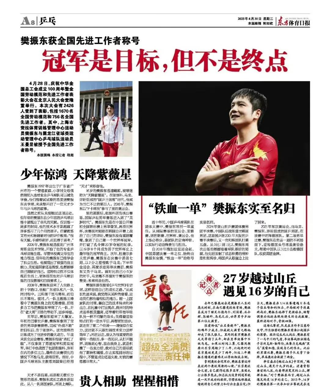 整版报道樊振东,自家人的待遇! 《东方体育日报》又整版报道了樊振东专版,即便他去