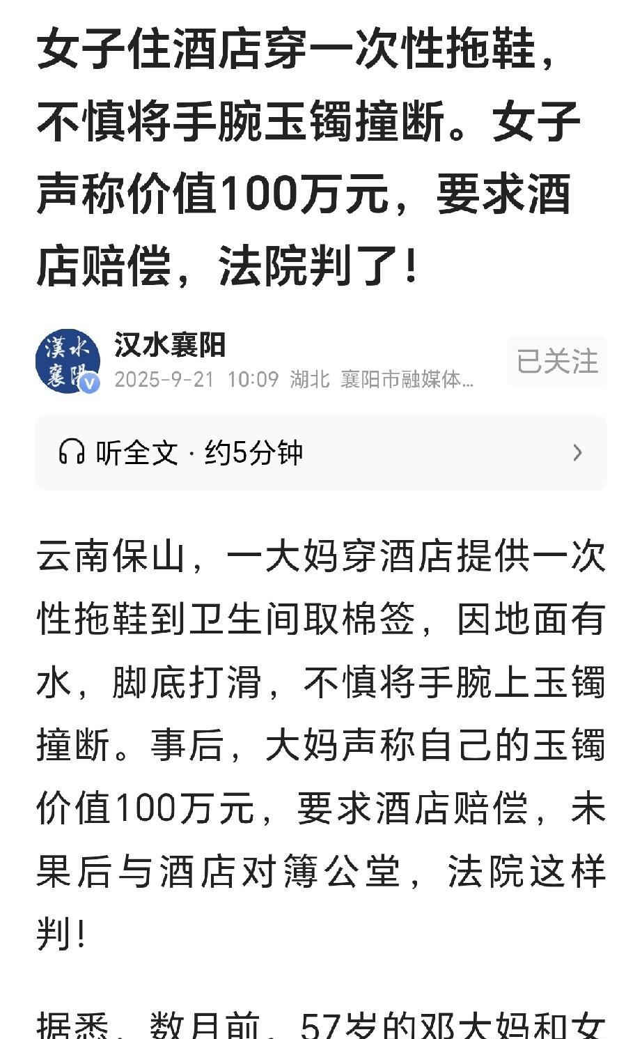 云南保山,一57岁大妈住酒店,洗完澡后,感觉耳朵进水,她穿酒店提供的一次拖鞋到卫生间取棉签,不料,卫生间地面有水,大妈脚下一滑,手上带的玉镯子被碰断了,大妈认为,自己脚下打滑,是因为卫生间地面有水,卫生间之所以有水,是因为浴室玻璃门无法关严,洗澡水溅出来,导致她脚底打滑,撞断了她100万的玉镯,因此,她要酒店来赔,酒店不赔,大妈告到法院,要酒店赔偿自己100万,再赔偿5万元精神损失费。 邓大妈57岁,和别的大妈一样,爱玩爱穿,还喜欢旅游,她几个月前,跟随女儿和朋友来到了外地。 几人住进一家酒店,酒店里的装修高档干净,几个人一路风尘仆仆,进去之后,首先就要好好休息。 到了第二天下午,邓大妈几人仔细观察,这家酒店里设施完善,服务很好,酒店设有温泉,供入住的客人休闲放松。 邓大妈一听,立刻拉上女儿去泡温泉,温泉水包含矿物质,泡上一会,浑身上下都通透舒适。 邓大妈泡完之后,回到自己的房间,又到卫生间冲了个澡,她洗完之后,擦拭干净,换好衣服,又把卫生间里的塑料拖鞋,换成了酒店提供的一次姓拖鞋。 这时女儿又进去洗澡,邓大妈坐在房间,慢慢擦拭着湿漉漉的头发,她觉得耳朵发痒,是刚才洗澡时耳朵里进水所致。 邓大妈没有多想,再次到卫生间想拿几个棉签,谁知她刚走进去,卫生间的地面上有水,她脚底下不由自主呲溜一滑。 邓大妈反应极快,为了保持平衡,她立刻用右手抓住卫生间门把手,左手抓住浴室间玻璃门。 可这一瞬间,意外发生,邓大妈左手带的玉镯碰到了洗浴室玻璃门上,只听见咣铛一声撞击,玉镯子断了。 大妈心疼不已,低头一看,卫生间地面湿滑,地砖处略微有点斜度。 她回到房间,越想越气,就是因为卫生间地面有水,这才导致自己差点滑倒,而卫生间之所以有水,就是因为浴室间的玻璃门关不严实。 玻璃门关不严实,洗澡时水就会溅到外面,导致卫生间地面有水,这才导致自己脚下打滑,碰断了玉镯。 大妈怒气冲冲,和酒店没完,她说自己手上这个玉镯价值100万元,是酒店没有尽到安全管理义务,酒店必须赔偿她100万! 酒店一听,吓一大跳,我们酒店提供的一次姓拖鞋,上面明明已经做了标注,标注上写着: 禁止穿入浴室! 而邓大妈不遵照标注的警示,自己穿着一次姓拖鞋去卫生间,她的滑倒是她自己所致,和酒店无任何关系。 邓大妈看酒店不赔,气的火冒三丈,直接就把酒店告到了法院,她要求酒店赔偿她100万元,外加赔偿给她50000元js损失费。 邓大妈认为,第一,酒店卫生间浴室玻璃门关不严,洗澡时水溅出来,导致卫生间地面有水打滑。 第二,大妈认为,酒店卫生间的门口有一点斜坡,这一点酒店没进行任何提示。 因此大妈认为,酒店为客人提供的设施,不符合酒店的行业标准。 可酒店认为,大妈当时并没有立刻报警,而是第二天才说她玉镯碰断,那么玉镯到底是何时何地碰断,这很难说的清楚。 大妈又说,玉镯价值100万,可是,口说无凭,她拿不出购买玉镯时的证据,不能仅凭嘴说,证人来说,必须要有购买凭证和价值鉴定才可以。 再者,大妈说玉镯是在酒店碰断,那也是她碰到门上才碰断的,和什么斜坡设计,玻璃门或者拖鞋并无关系,是偶然突发事件,是她自己所致。 那么,这件事在法律上是怎么认定的呢? 《民法典》第1198条规定: 经营场所的经营者未尽到安全保障义务造成他人损害的,应当承担侵权责任;但若已尽合理义务,则无需担责。 法院经现场勘察确认,酒店提供的浴室玻璃门完好、正常使用时,洗澡水并不会流到卫生间里。 并且,卫生间地面坡度设计合理,并不会导致客人滑倒,酒店向客人提供带有明确使用提示的拖鞋,标注有“禁止穿入浴室”的提示。 因此,酒店不存在安全保障义务的违反,邓大妈要求酒店赔偿的主张缺乏事实依据。 《民法典》第1173条规定: 被侵权人对同一损害的发生有过错的,可以减轻侵权人的责任;若损害完全因被侵权人过错造成,侵权人不承担责任。 邓大妈作为完全民事行为能力人,应预见以下风险却未谨慎行事: 第一,邓大妈明知一次姓拖鞋不具备防滑功能,并且,拖鞋上标注了“禁止穿入浴室”,但邓大妈仍穿着进入湿滑的卫生间内。 第二,大妈佩戴价值高昂的玉镯进入湿滑区域,未采取任何保护措施,放任风险发生。 因此,损害是完全因邓大妈自身过错导致,酒店并不需要承担责任。 《民事诉讼法》第64条规定: 当事人对自己提出的主张,有责任提供证据。 邓大妈主张玉镯价值100万元,但未购买凭证或鉴定报告,无法证明玉镯的实际价值及断裂前的完好状态。 邓大妈第二天才报警,无法证明玉镯断裂直接因酒店过错导致。 因此,法院认为,邓大妈作为原告,需承担举证不能的不利后果。 法院判决,驳回邓大妈的上诉请求,酒店不承担赔偿责任,由邓大妈承担诉讼费5750元。 对此,你怎么看?欢迎评论区留言讨论。 关注@王哥说法 多学法律!