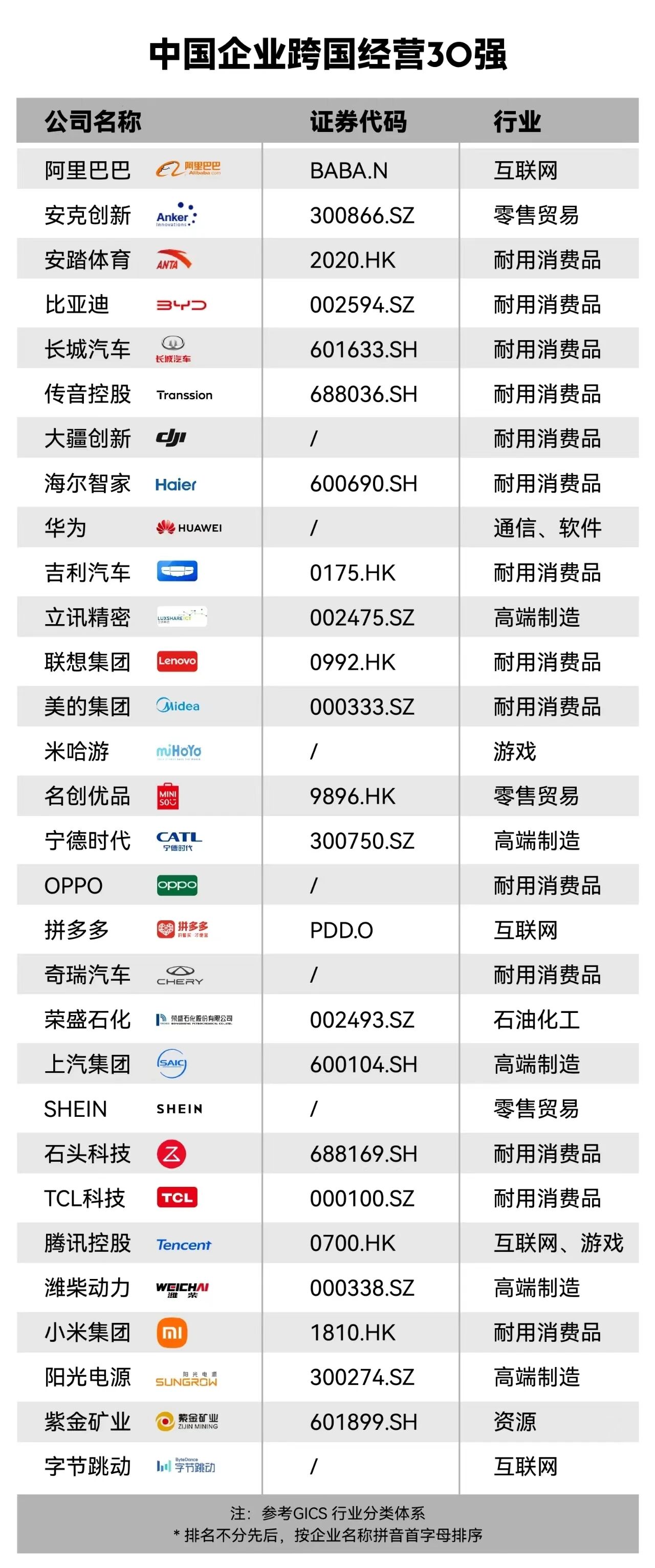 2023年至2025年,福布斯中国连续3年推出“中国企业跨国经营30强”(第一年是50强),考核标准涵盖企业的海外收入、占比、增长率,以及海外市场占有率、海外布局建设情况等,其中最重要的指标是海外收入及海外收入的贡献比重。 简单来说就是,这是一份每年在海外市场最赚钱的中国企业30强榜单。从3年来的该榜单情况变化来看,优秀企业不断涌现,有些企业一直停留在榜单之上,比如比亚迪、宁德时代和美的集团等,有的企业则已暂时落选,比如华为、小米、大疆和米哈游等。 海外市场能不能盈利,不同产业领域的中国企业境遇不同 某种程度上说,跨国经营30强榜单也是不同产业领域中国企业征战全球的风向标。比如,2025年的榜单,制药/生物科技、汽车制造商表现出色。2024年的榜单,互联网巨头、汽车制造商是海外市场的大赢家。2023年的榜单,产业领域就更庞杂一些,从传统产业到战略性新兴产业,都有中国企业在海外市场收获颇丰。 为什么3年来该榜单的产业领域有越来越窄的趋势?一方面,全球市场越来越疲软已被证实,一方面,中国企业在海外市场的获利确实越来越难。 连续三年上榜的企业,有比亚迪、宁德时代、紫金矿业等 从2023年到2024年,连续上榜的公司仅13家,2025年这个数字继续减少。 三年来坚守在跨国经营30强榜单上的企业,以比亚迪、宁德时代、立讯精密、美的集团、紫金矿业等企业为代表,从新能源汽车、动力电池到电子设备制造、家电、矿业,新锐产业和传统产业并行,中国企业的出海路步步留痕。 电子设备、汽车制造、半导体、生物医药,这些产业领域更易出现连续上榜的企业,也涌现出了更多的新上榜企业,中国企业于上述重点产业的海外布局正在加速。 滑出榜单的企业,有华为、小米集团、大疆创新等 2023年、2024年还在跨国经营30强榜单上的华为、小米和大疆,2025年都消失不见。并非上述企业的海外业绩不佳,而是其国内业务企稳,海外市场投入较大、收益减缓。而且,新上榜的企业更加优秀,比如今年新上榜的百利天恒、瀚森制药、康方生物都来自生物制药领域,正是市场的新宠儿。业界预测明年还将有更多中国创新药企有望上榜。 3年来的榜单,只在2023年出现过工商银行和中国银行两家金融机构,可见金融领域出海并不顺畅。 2023年、2024年连续上榜的米哈游,2025年已经滑出榜单,中国游戏出海的近况更显复杂。 被吐槽火得莫名其妙的泡泡玛特也在2025年的新榜单上,但明年其能否入选确实存疑。与之情况类似的,是来自宠物经济的乖宝宠物。 至于2024年还在榜单上,刚刚因旗下始祖鸟在喜马拉雅山放烟花被大众猛烈抨击的安踏,2025年的下滑可能只是开始。