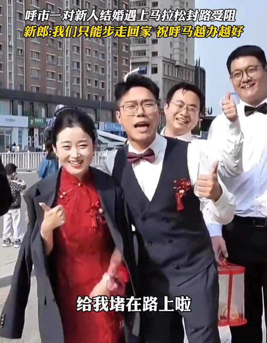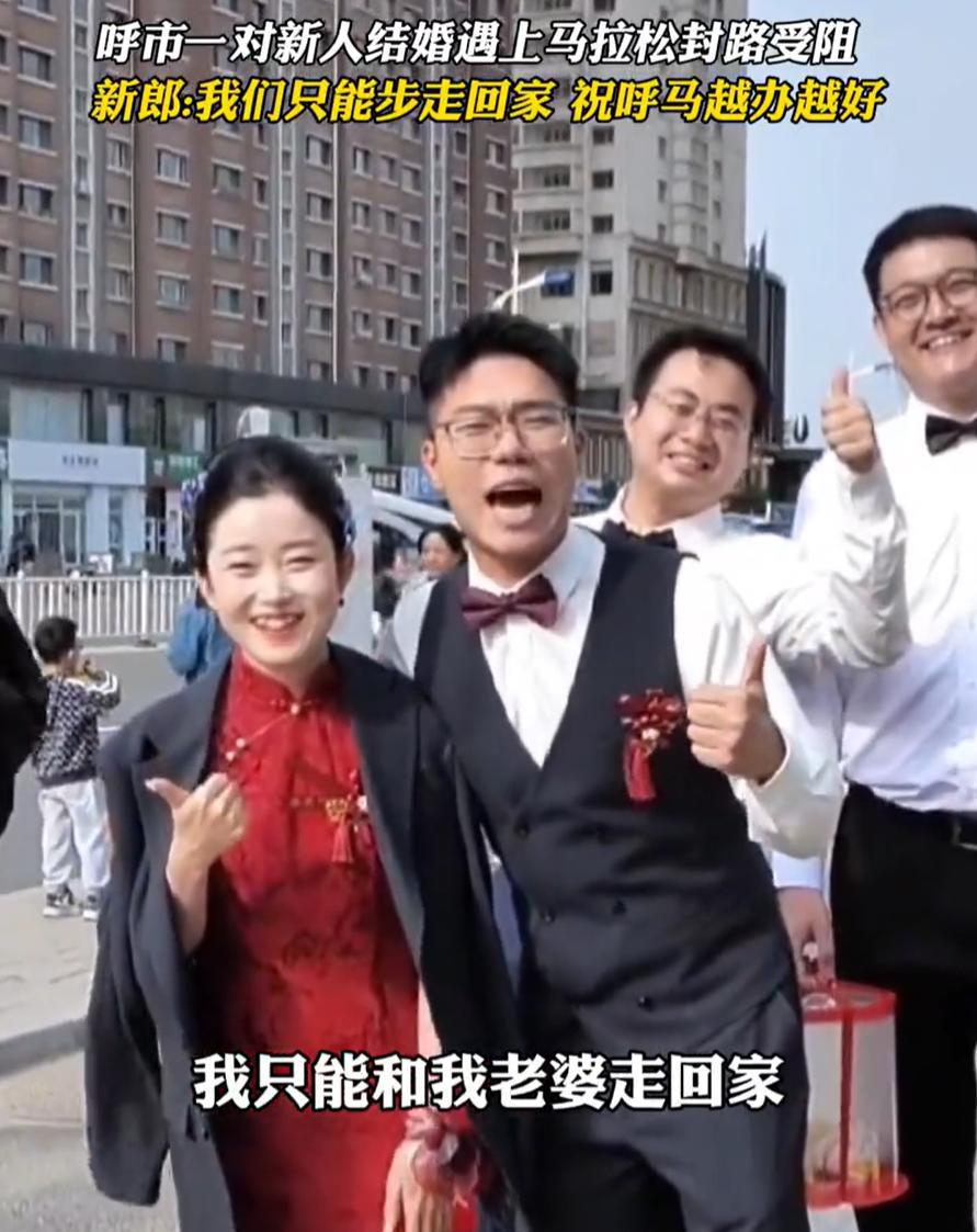 “这心态绝了!”内蒙古呼和浩特,一对新人结婚,大喜的日子偏偏撞上了马拉松封路。按