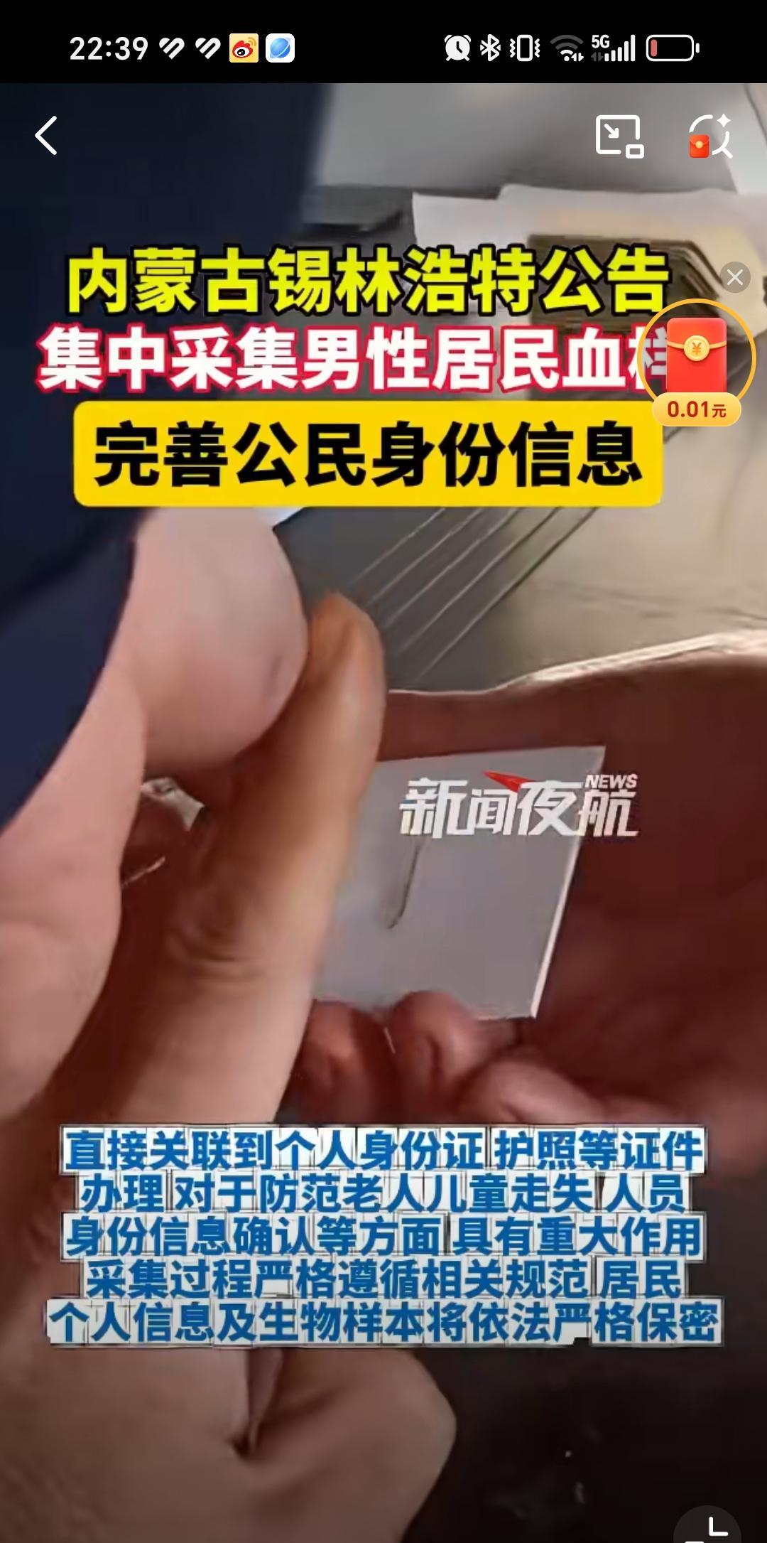 9月21日内蒙古发布锡林浩特公布采集男性血样录入DNA数据库。作用完善个人身份信