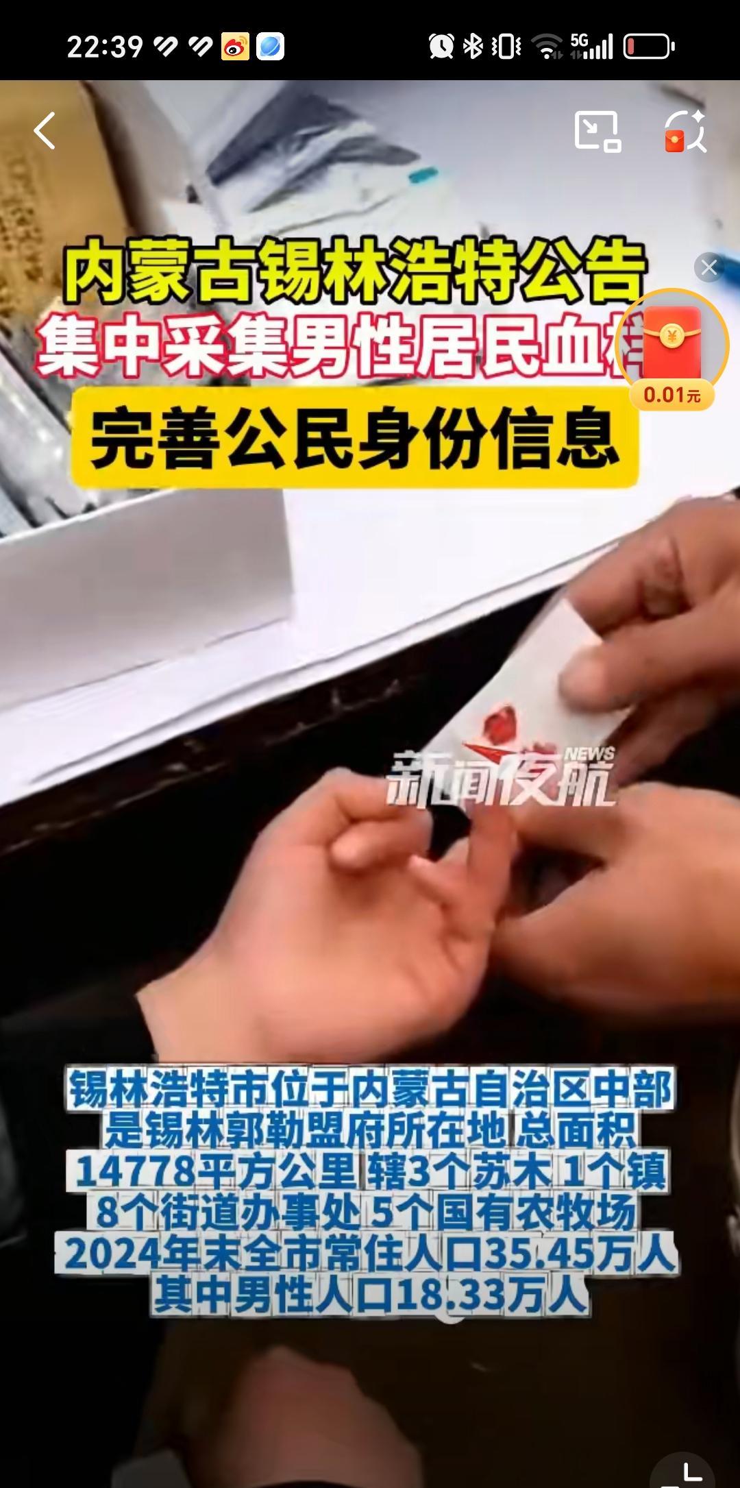 9月21日内蒙古发布锡林浩特公布采集男性血样录入DNA数据库。作用完善个人身份信息,对护照和身份证都有关联。我感觉这个地方人少35.45万人,其中男性才才18.33万所以感觉这就是开始,以后大数据应该全国都会录入,老人和儿童走失也好找,但是不知道有没有父子不是的结果出来,家破人亡的。 这样也好有DNA数据私生子找爸爸分割遗产,或是自己儿子是不是亲生的都有DNA血样了应该好比对。 但是不知道有没有老婆和别人生孩的会不会发现,说是保密,但是录入了总有意外。所以这样也挺好。就是不知道为什么都是男士录入女人不录入。