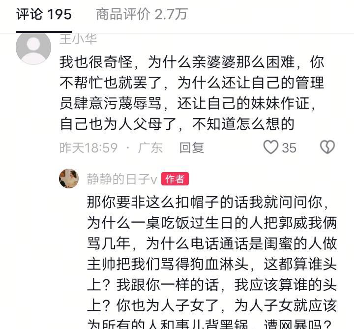 田静难得回答网友的提问,说了那么多的话,只不过有点答非所问! 昨天网友说: 亲婆婆困难,不帮忙也就算了, 自己的管理M婆婆, 自己妹妹还去为管理作证, 真不知道怎么想的! 田静居然回复了: 你这是扣帽子! 为什么一桌过生日吃饭的人, 把郭威与我骂了几年? 为什么通话是闺蜜的人做主帅,把我们M的不轻,又算谁的头上呀? 田静说了这么多,并没有回答网友的疑问,只是说是被扣帽子,又诉说了自己的委屈,认为自己与郭威不应该受到莫须有的网暴! 听得出,田静非常的委屈, 田静话里的那个闺蜜,说的又是谁? #田静怼人#