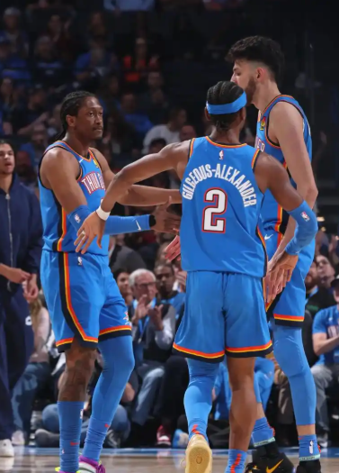 第一队:乔治、亚历山大、切特、威少、亚当斯 第二队:杜兰特、杰伦-威廉姆斯、伊巴卡、保罗、哈滕