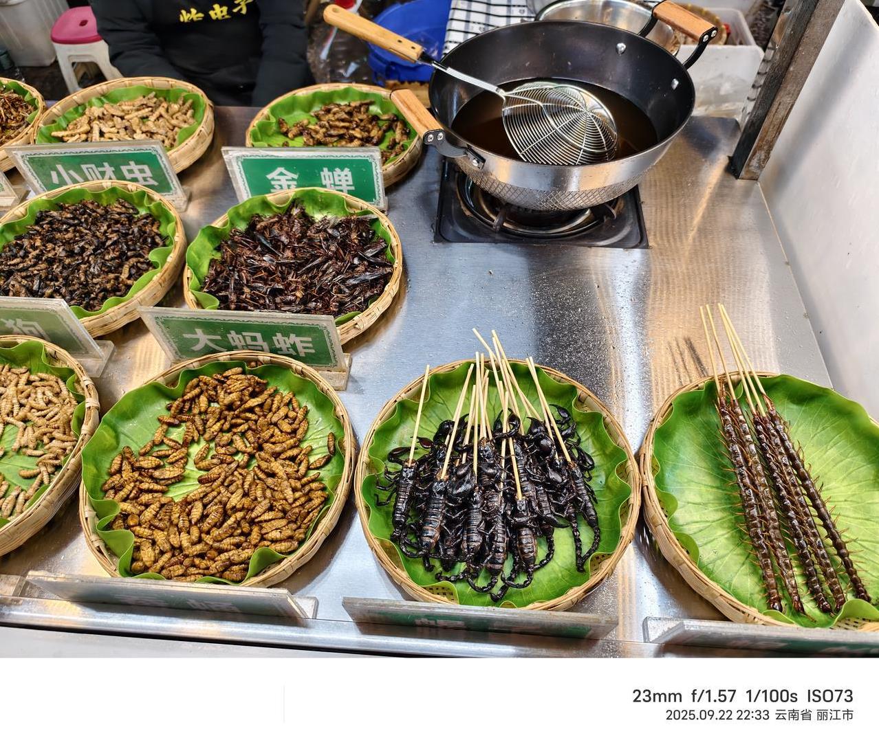 今天白天拍极氪9X,中午在一个农家院吃的土鸡菌汤火锅,真的是现杀现做的,等了整整两个小时[捂脸]然后做的味道一般,我都没拍照哈哈。 晚上我们又去丽江古城吃了一顿野生菌鸡火锅,要煮25分钟才能吃,否则后果自负[破涕为笑]红伞伞白杆杆,吃完躺板板。晚上这家味道还行。 吃完饭逛了逛夜市,吃的东西真的多,而且很奇怪,啥辣椒拌水果,还有云南十八怪,三只虫子一盘菜,吃的真的是虫子,我可不敢吃,最后买了一个冰箱贴回家纪念一下。 这次是来拍车的,没时间玩,明天就要走了,下次有时间再来哈哈,云南的天空是真的好看,云朵都是3D立体的。