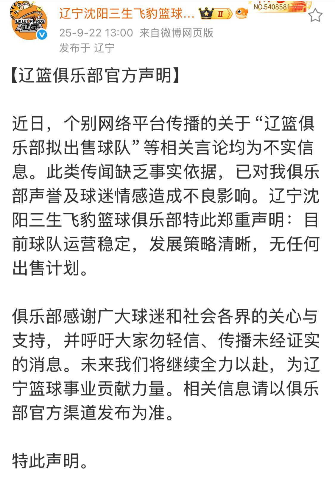 辽篮俱乐部发布辟谣声明,说球队目前无任何出售计划。 9月22日,辽篮俱乐部发布官