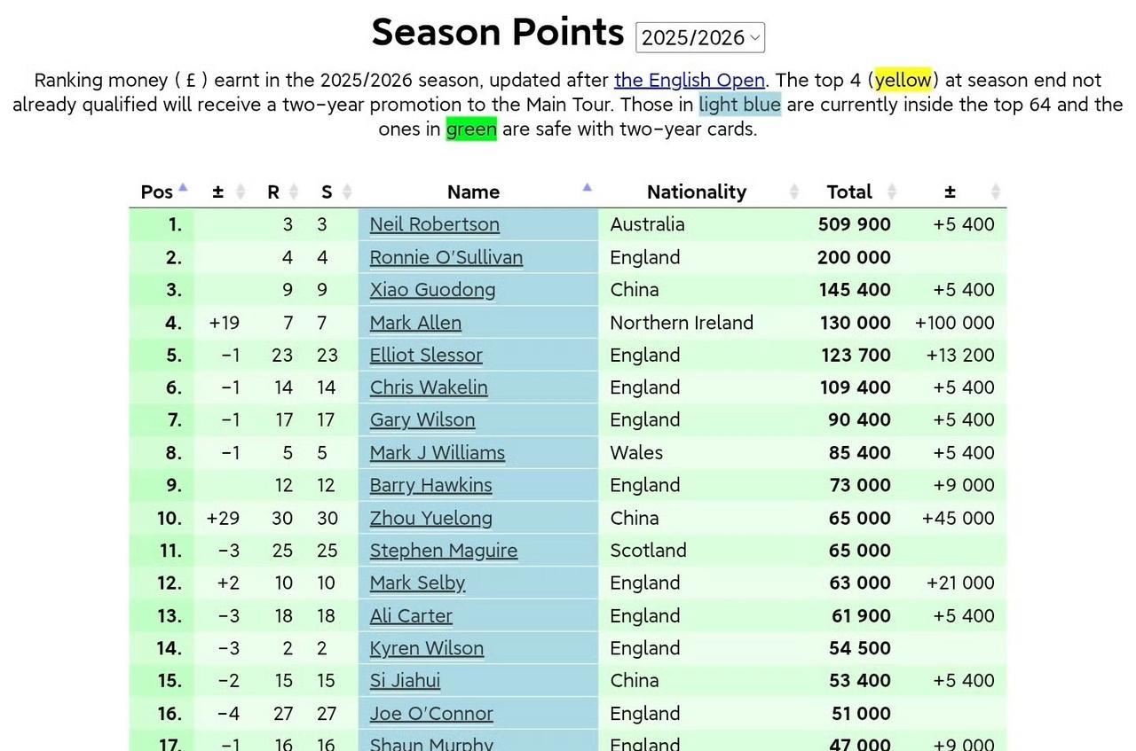英格兰公开赛后斯诺克单赛季排名发生变化: (单位:英镑) 罗伯逊遥遥领先,奥沙利文第二,英格兰公开赛冠军艾伦升至第4,亚军周跃龙第10,肖国栋依旧高居第3,另外丁俊晖和赵心童仅排第18和19。#斯诺克#
