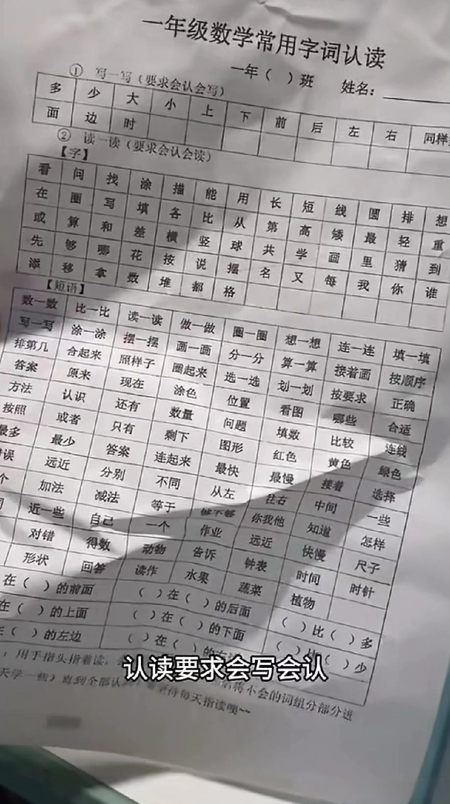 女子吐槽一年级既不教一个汉字,也不教aoe,开学后只发了一份一年级数字常用字词认