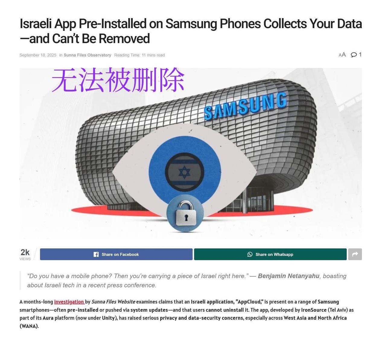 这次不是传呼机!数据安全问题在中东地区又爆严重漏洞,而始作俑者是韩国三星手机。 三星在中东,北非以及西亚地区(懂的都懂)销售手机,均会预装一款Appcloud云端备份软件,且几乎无法删除。目前该软件被多久第三方机构发现过度、不正常收集手机机主数据。 开发软件的公司,是一家以色列的数据“安全”公司——惊不惊喜?意不意外?
