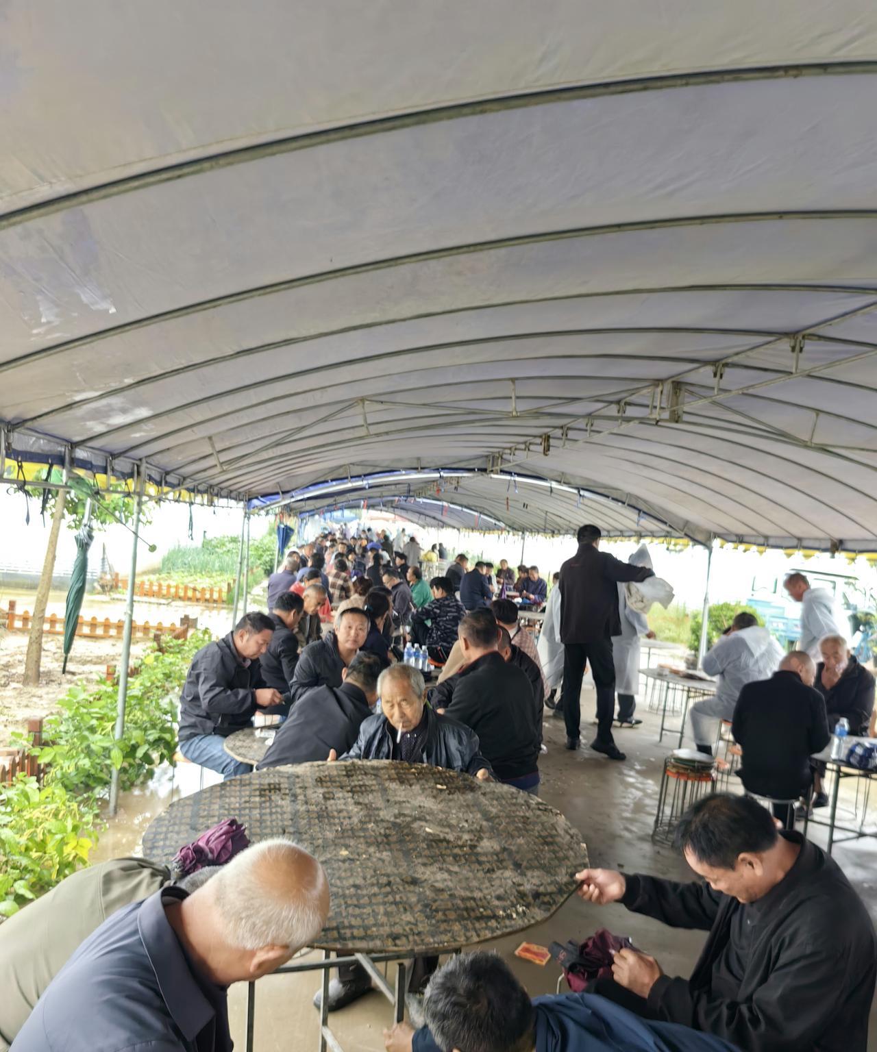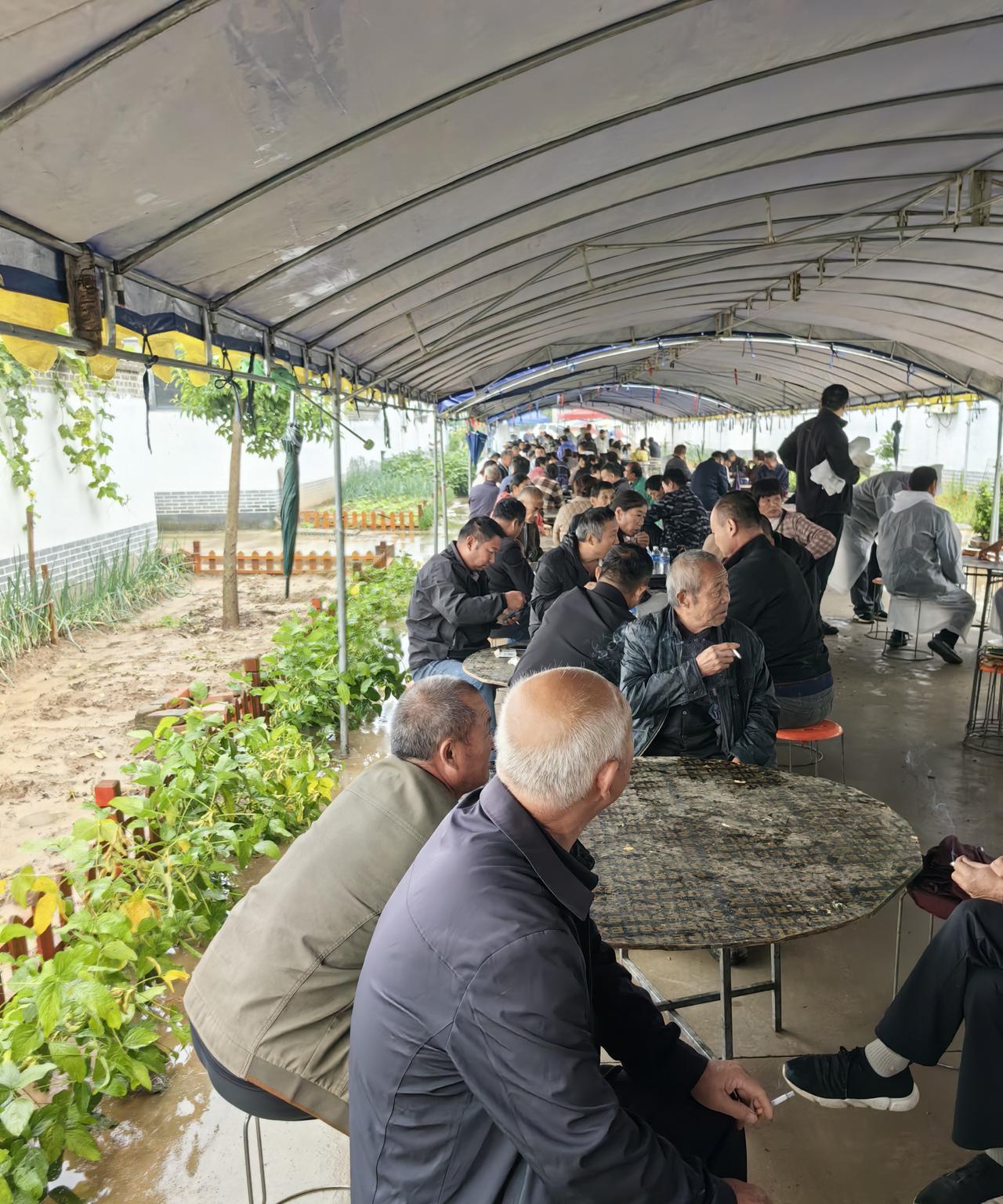 我们农村吃大席就是这样的,下着大雨风雨不阻也得参加,看好的日子不能改变。下着雨就是这样,搭个棚子就是条件很好了,有时候参加这样的场合。就是淋着大雨吃席,赶啥天就是啥天,不管酷暑还是严寒。一桌酒席的价格在240到300之间,一桌坐八个人也能吃饱。农村的丧事都是这样的吃饭,一般都拉桌30到一百桌左右。亲戚朋友多的就拉的多,还有一个村子的邻居和近门,所以办这样的事就得这么多桌。你们参加过这样的场合吗?