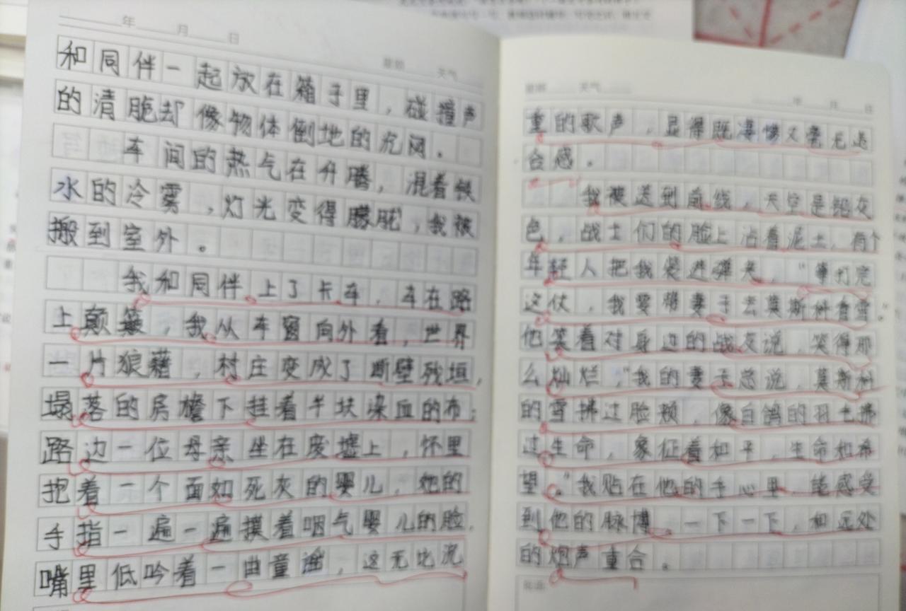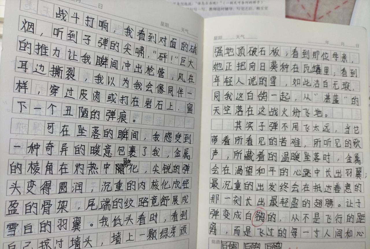 六年级孩子能写出这样的日记——金属羽。我和孩子们,热烈的掌声。 六上第二单元习作是变形记,当同龄孩子还在写自己变成小蚂蚁,老鹰,一朵云,一个路灯时。 这个小姑娘,却是把自己变成一颗子弹。 开头以“俄乌战争”引入,一句,子弹飞多久才能变成白鸽。表达了反战,期待和平的主旨。 文中她以一颗子弹的亲身经历为视角,选取两个有象征性的画面——家园被毁母亲失去孩子;情侣分别时,对美好未来的憧憬,世间最美好的事物被毁灭,写出了战争的残酷。 写日记的是位平时少言寡语,爱读书,爱思考的小姑娘。 她用自己独特视角,细腻感受,精彩表达,写出了对战争的厌恶,对和平的渴望平。 班里朗读者小晗,饱含深情地朗读其中两个精彩片段,我们报以热烈掌声。 大新老师说教育@小学语文教师 @中国教师报