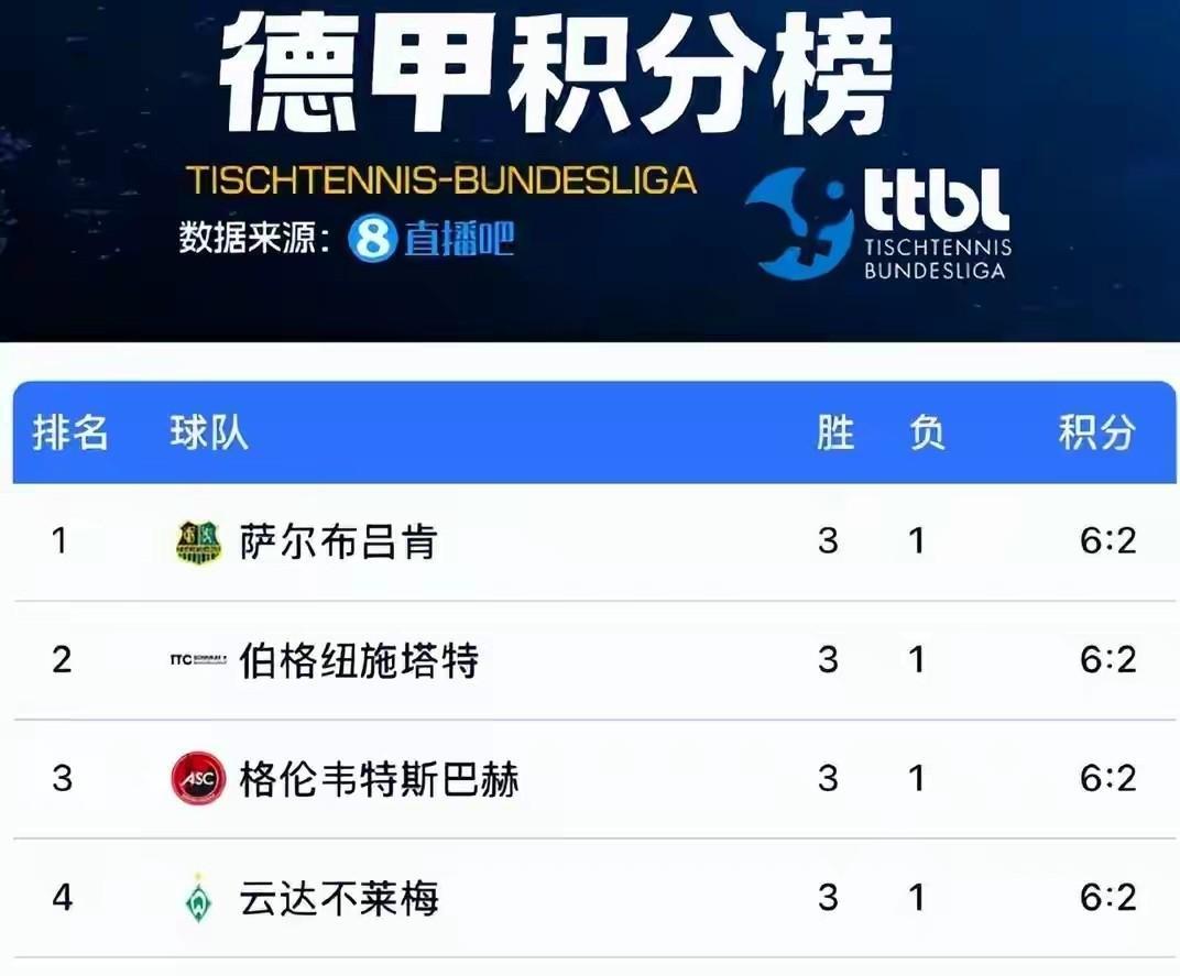 东哥看完英超回来,球队排名第一了! 昨天德甲比赛, 东哥轮休, 去英国看阿森纳和曼城比赛。 弗朗西斯卡率队3:1取胜! 萨尔布吕肯队首登德甲第一! 上次弗朗西斯卡打澳门冠军赛, 樊振东率队3:0获胜。 萨尔布吕肯有了两员猛将, 今年德甲冠军更轻松了!