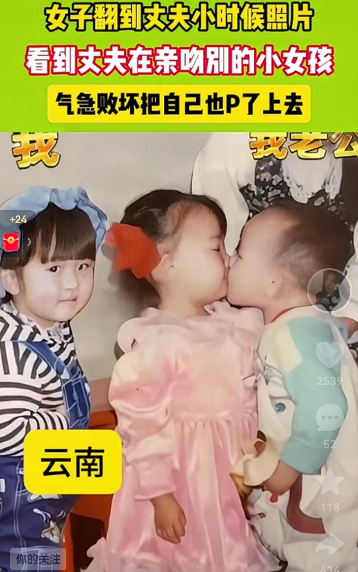 这下好了,不仅老婆知道了,全国人民都知道了! 云南,一女子在家里打扫房间,无意间在柜子里找到一张丈夫小时的照片,而照片上面,竟然是丈夫在亲吻一名小女孩,虽然两人当时还处于不懂事的年纪,但女子看到后还是醋意大发,甚至还把自己P了上去 照片上,小男孩正认真地在亲一个小女孩的脸。两人当时估计也就是幼儿园的年纪,但动作倒是挺专注,尤其是她老公,凑近的模样一脸认真,小女孩也没躲,两人仿佛都沉浸在那个瞬间里 这画面要是放在现在,大人看了可能一笑而过。可这位妻子却有点小吃醋,虽然知道那是孩子间天真无邪的举动,但心里还是忍不住泛起一丝酸意。她灵机一动,动手把照片扫描后,用修图软件把自己小时候的照片P进了画面里,就站在两个小孩的后边 结果这一P,反而让整张照片的意味变了。她自己站在边上,不仅没融入进去,反而像个突然闯入的旁观者 有网友调侃说:从各自表情和动作可以看出:一个很主动,一个很陶醉,一个无奈的排队等着被吻 当然,玩笑归玩笑,这类小插曲没必要放大。照片本身就是回忆,带着点年少的傻气和纯真,反倒更值得珍惜 如果硬要把自己塞进那个记忆里,只会显得多余。与其改照片,不如把它放进相册里,等哪天朋友聚会时拿出来笑谈一番,那才更有味道