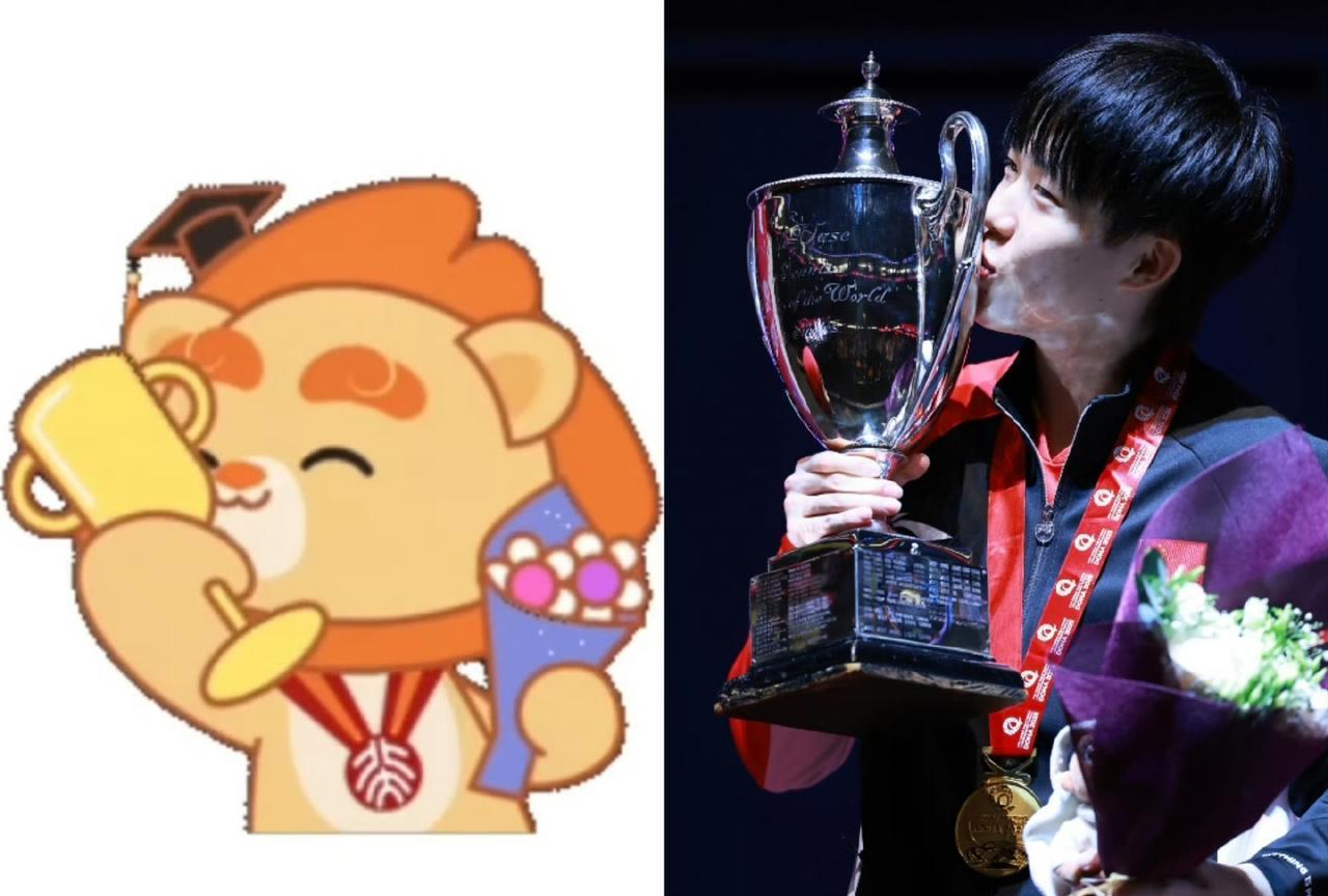 北大文创狮子,左手持拍,亲吻奖杯,好像我们王楚钦啊! 文创狮子和乒乓狮子是有莫
