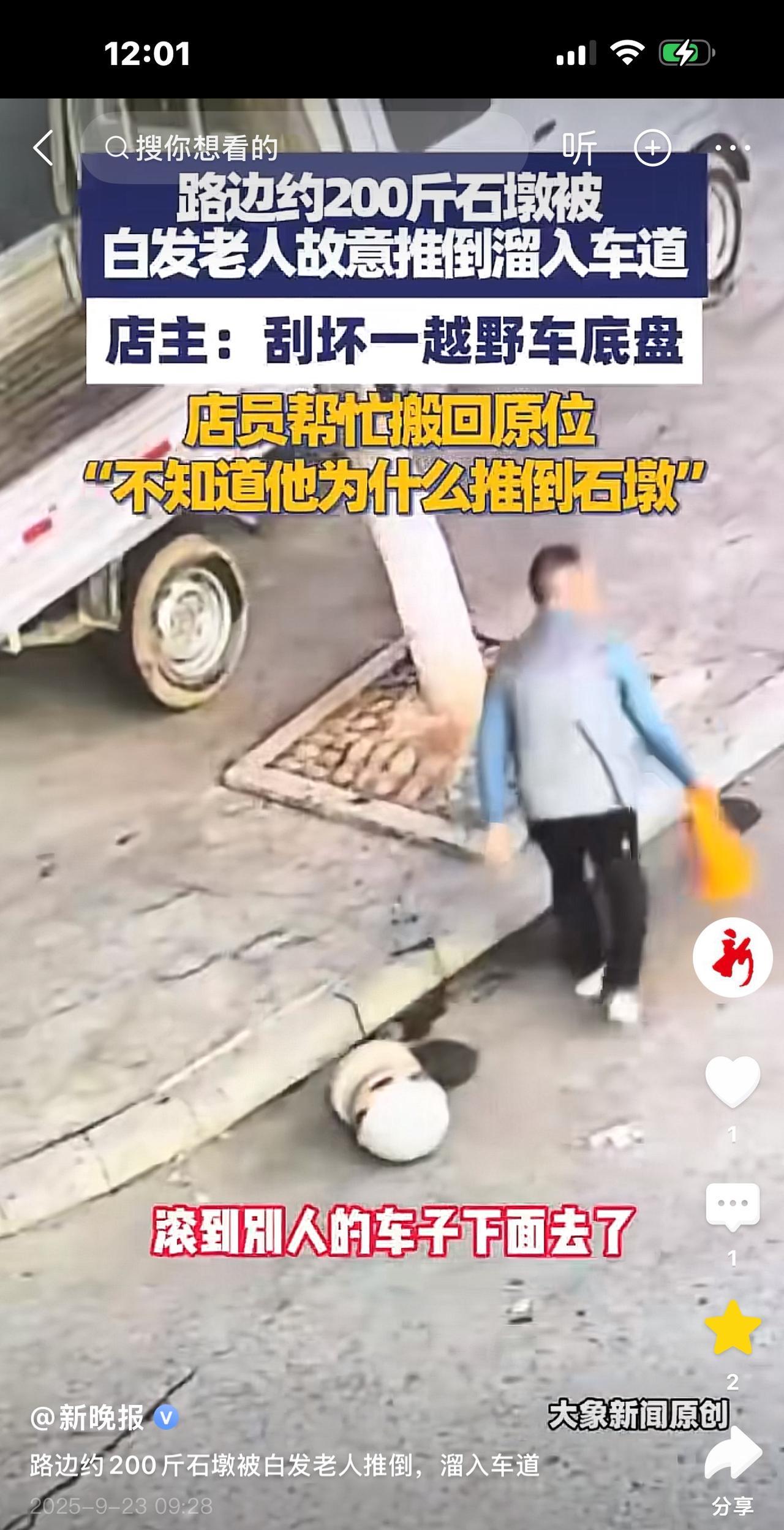 这位老人60多岁,好坏!他在马路上,把立着用来坐的圆石墩一把放倒,滚入人家车底下,损坏底盘后扬长而去! 事发于湖南邵东。 9月22日,一位穿蓝色衣服、灰色背心的老人,脚蹬一双白色运动鞋,大概60多岁,他提着一个黄色环保袋子往前走,就像大街上普通的行人。 突然,他看见街上的一个圆形石墩,就是公共地方让人方便坐下来的那种石墩,他抬头往左边瞅了一眼,大概是发现没人吧,然后他把自己的黄色袋子一甩,扔到了路边,他眼疾手快,迅速把石墩放倒,石墩滚滚后面而行,他连看也不看一眼会发生什么后果,就扬长而去了。 那个石墩被推倒以后,滚滚而去,滚到了一辆越野车的底下,把人家的底盘砸坏了,车主还不知道呢。 附近一位店员看见这种情况,赶紧跑过去把石墩扶正,店员无奈地说: “大爷大概有60多岁将近70岁的样子,他搬动那个石墩滚到别人的车子底下去了,把人人家车底底盘刮了,不知道他为什么要这么做。” 瞧大爷这力气,石墩大概有200斤重,他竟然能一把推倒,说明他老当益壮,力气不小,身体好着呢,可是为什么有这种一时突发的邪念呢?就像一个小孩子干了坏事,一个人偷着乐一样。 大家都说人性有善有恶,是善恶同体的,但是,大多数人受过教育以后,都会依法守规,用道德约束自己,不干坏事,这个社会才能够和谐美好起来,所以即便有时,内心有恶的小野兽蠢蠢欲动,一般人都会压抑自己人性的邪恶的这一面,不让它冒出头来,不作恶,平时高兴的时候也会向社会表达善意,而非像这位大爷一样,任骨子里的恶随意释放,损坏别人的财物,伤害他人! 可惜这个老人没有想到,监控把他的恶劣行径全拍下来了,不知道会不会进拘留所呢,如果要进局子也活该吧,他必须为他自己随心所欲的恶意行为承担后果! [泪奔][泪奔]