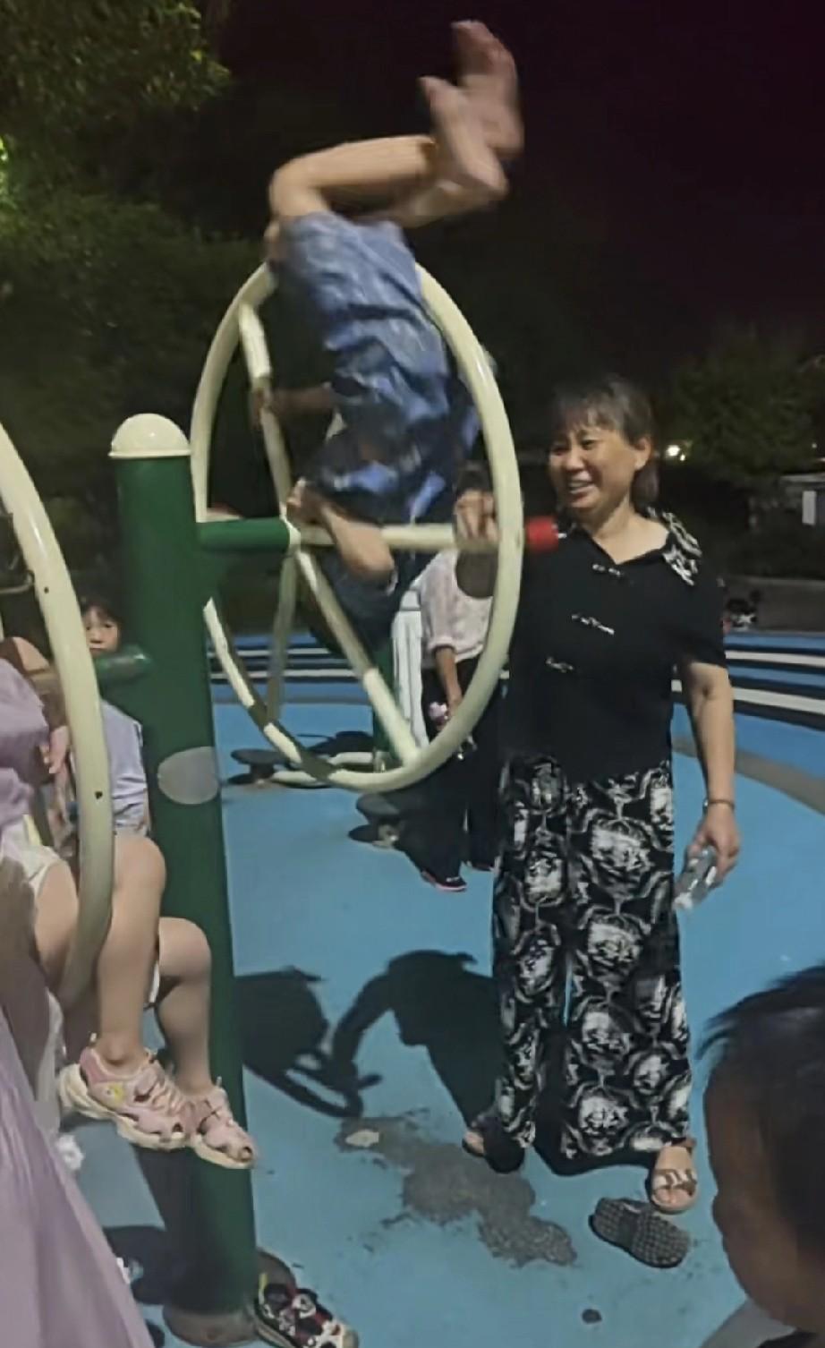 这位奶奶在小区广场健身器材上转大孙子,希望孩子父母看到这视频后,快去医院给孩子检查一下,再也不能把孩子交给这无德的老人,这种奶奶要是被儿子儿媳妇看到,肯定叫你滚回老家去,这就是虐待儿童啊!不是太无知了就是没安好心!在旁人来看,这也太危险了吧,在小孩来看,厉害,转这么久。在奶奶来看,我孙子真棒。在孩子自己来看,心里想我得抓紧别掉下去。不同的人不同的视角。这要是出事?是找器械厂家?还是找物业呀?这个老太有责任吗???