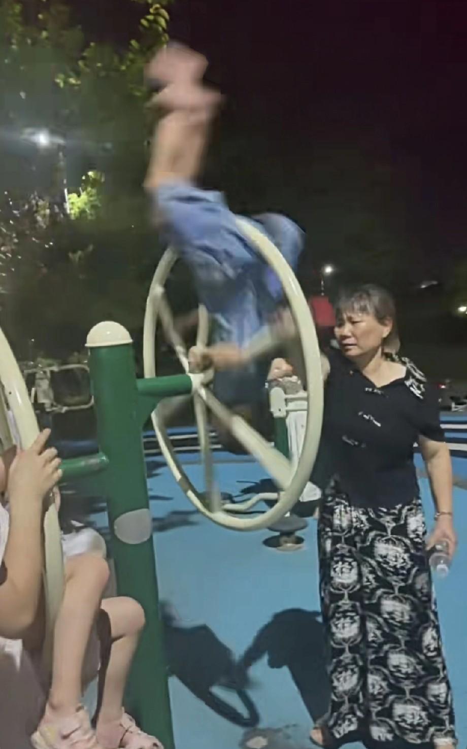 这位奶奶在小区广场健身器材上转大孙子,希望孩子父母看到这视频后,快去医院给孩子检
