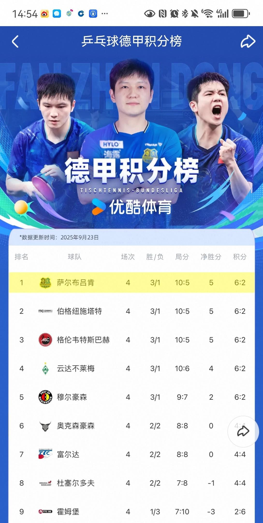恭喜东哥的萨尔布吕肯队位居榜首啦 德甲第四轮过后,东哥所在的萨尔布吕肯俱乐部,以4战3胜1负,局分15局10胜5负,净胜分5分,积分6:2的战绩位列积分榜榜首。 东哥首轮出师不利,分别2:3不敌伊鲁斯和1:3不敌杜达。第二轮渐入佳境,分别3:1泽利科和3:1贝塔斯迈尔。第三轮19分钟3:0搞定沑汀克。东哥第四轮休战,但小弗队长2分进帐,与达科的1分,助队伍3:1获胜。 东哥加油,萨尔布吕肯队加油!