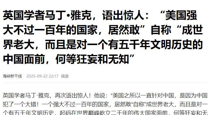 英国学者马丁·雅克,再次语出惊人!他说:“美国之所以一直针对中国,是因为中国犯了一个大错!一个强大不过一百年的国家,居然敢“自称”成世界老大,而且是对一个有五千年文明历史,起码在世界巅峰屹立二千年的伟大国家面前,何等狂妄和无知!” 这话一出来,不少人第一反应都是 “懵”:中国这几年安安分分搞发展,既没去别的国家家门口挑事,也没像某些国家那样到处搞 “小圈子” 围堵别人,怎么就 “犯错” 了? 他说的 “错”,根本不是中国真的做错了什么,而是美国眼里的 “错”:一个才强大了不到一百年的国家,居然敢在一个有五千年文明、在世界巅峰站了两千年的国家面前,把自己当 “世界老大”,还容不下别人发展,这本身就是一种狂妄到无知的执念。 他不是那种随便发表言论的 “网红学者”,从上世纪 80 年代就开始关注中国,见证了中国从改革开放到成为世界第二大经济体的全过程,他的观点从来不是靠 “情绪化吐槽”,而是基于历史和现实的分析; 第二,他说的 “美国强大不到一百年”“中国巅峰两千年”,是不是事实? 美国从 1776 年独立算起到现在,满打满算也就 240 多年,真正成为世界霸主,是在二战之后,算下来也就不到 80 年; 而中国呢?从秦汉统一开始,无论是经济、文化还是科技,很长时间里都是世界的 “优等生”:唐朝的长安城是当时全球最大的城市,吸引着世界各地的人来学习; 宋朝的 GDP 占当时全球的一半还多,活字印刷、指南针这些发明改变了世界; 就算是明清时期,在某些领域也依然保持着领先。这么算下来,中国在世界巅峰的时间,确实是以 “千年” 为单位的。 它习惯了二战后 “一家独大” 的日子,觉得全世界都得围着自己转,可偏偏中国没按它的 “剧本” 走。 这些年中国靠自己的努力,在基建、新能源、科技等领域一步步赶上来,甚至在某些领域超过了一些发达国家,比如新能源汽车,中国的产销量占全球一半以上; 可在美国眼里,中国的发展不是 “共同进步”,而是 “挑战权威”。 它没法接受一个不是 “自己人” 的国家,居然能在自己擅长的领域里超越自己,更没法接受这个国家还有着比自己悠久得多的文明底蕴,因为这戳破了它 “霸权永恒” 的幻想。 从提出 “人类命运共同体”,到推动 “一带一路” 合作,中国一直说的都是 “共商共建共享”,从来没像美国那样动辄喊 “美国优先”,也没像某些国家那样到处搞军事基地、发动战争。 现在中国搞 “一带一路”,也是为了帮其他国家建基础设施,让大家一起赚钱,这跟美国搞的 “阵营对抗” 完全不是一回事。 因为中国明白,真正的强大不是靠 “卡别人脖子”,而是靠自己的实力,更不是靠把别人踩下去。 一个真正强大的国家,不会害怕别人的发展,而是会在竞争中提升自己;一个有底蕴的文明,也不会靠打压别人来证明自己,而是会用包容和合作赢得尊重。