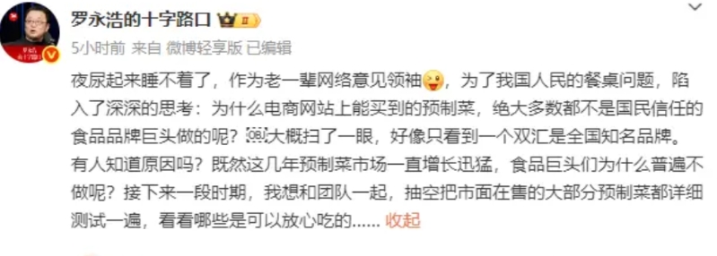 那就是老百姓心心念念的餐桌问题,老罗打算和团队一起,抽空把市面在售的大部分预制菜都详细测试一遍,看看哪些是可以放心吃的。