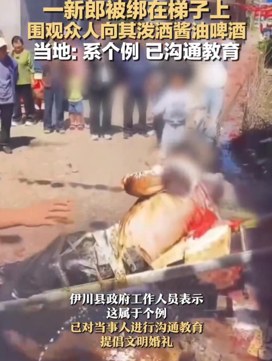 成何体统!河南洛阳,一对新人结婚,本来是大喜的日子,新郎却被朋友们绑到梯子上面,又是倒酱油,又是泼啤酒,场面相当尴尬,而当地回应:系个例! 视频中,新郎被人用绳子绑在了一把绿色的梯子上,动弹不得。接着,有人拿起酱油,从头到脚给他浇了下去,深色的液体瞬间浸透了他的衬衫和裤子。这还没完,旁边又有人打开啤酒,对着他一阵猛泼。新郎整个人被酱油和啤酒的混合物包裹,现场一片狼藉 围观的人不少,有人举着手机在拍,有人在笑。从表情上看,被绑在梯子上的新郎似乎没有明显反抗或不高兴,拍摄者后来也解释说,这是新郎自愿的,之前和朋友商量过,就是为了闹着玩,图个热闹 伊川县工作人员回应,说这是个例,不代表普遍现象,已对当事人进行沟通教育 这话不假,确实不是每场婚礼都这样。但类似的婚闹画面,我们好像隔一阵子就能看到一次。从往脸上涂墨汁、砸鸡蛋,到把新郎绑在树上、扔进水里,形式五花八门,尺度有时大到让人瞠目 我觉得,娱乐可以有,但要有度。朋友间搞些小游戏、整蛊一下可以,但最好选择双方都舒适的方式