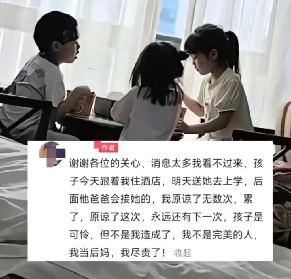 心酸!今天刷到一个视频,女子遭丈夫背叛出轨,带着自己亲生孩子离开,继女打着伞跟了一路! 女子和丈夫都是二婚,丈夫带着前妻生的女儿,女子带着和前夫的儿子组成了一个新家庭,婚后两人又生下了小女儿。 谁知丈夫竟多次出轨,屡教不改。女子为了孩子原谅丈夫一次又一次,丈夫一家笃定女子会为了孩子忍气吞声,所以一次次拿捏女子软肋。 可女子真的累了,她收拾行囊带着自己亲生的两个孩子离开,外面下着雨,丈夫一家也不管女子,他们觉得女子为了孩子,不会真的离开。 继女打着伞,背着书包,跟在他们后面。女子走,她就跟着走,女子停下,她就眼巴巴地看着,看得女子心都碎了! 最终,女子还是不忍心,带着继女一起走了。当晚他们住在了酒店,并商议继女的去留,最终决定让爸爸接走孩子。 女子表示:“作为后妈,我已经尽力了,我真的养不活三个孩子。” 亲生母亲几年时间不管不问,继女却愿意抛下亲生父亲和爷爷奶奶,选择跟后妈走,可见后妈对待继女与对待亲生孩子无异。 可是生活所迫,女子独身带两个孩子也不容易。希望女子能够坚强起来,也希望三个孩子都能健康快乐的长大!#出轨# #对背叛的反思# #感人#