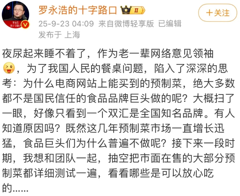 罗永浩又下馆子了,点了7个菜,花了370块钱。 新鲜,现场,吃到撑。 这次他吃到有锅气的菜了。 他说,同样是连锁,同样开在商场。你做不到,就让别人做吧。 半夜起来夜尿后,睡不着的他开始回味这个味道。然后,决定干一件大事:把市面上的预制菜来个大测试。看看哪些是可以放心吃的……