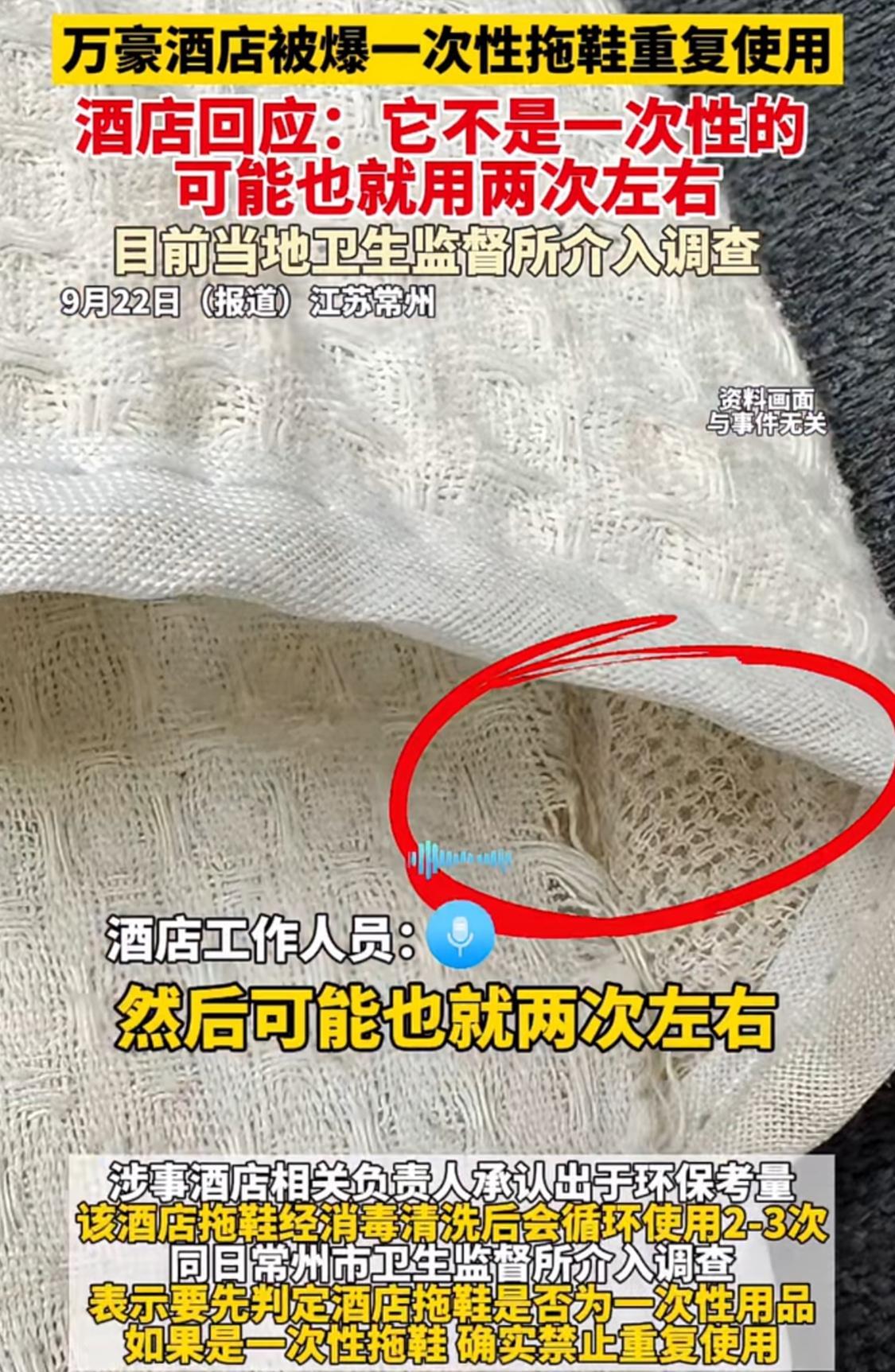 五星酒店把一次性拖鞋重复使用,被发现后说成为了“环保”,如同公众人物失德被曝光后说成“缺乏xx感”、西贝们为了“统一口味、提高效率”、“炸山”的用的都是“环保材料”且经过反复认证不会破环生态一样,都只是在给自己犯的错找听起来冠冕堂皇的借口罢了! 9月20日,有网友曝光江苏常州一家万豪酒店提供的拖鞋存在严重卫生问题,不仅明显起球,鞋内甚至还有毛发,质疑其被重复使用。21日,酒店相关负责人承认,为了“环保”,拖鞋在消毒清洗后会循环使用2至3次。 目前当地监管部门已介入调查,酒店追求“环保”没错,但是否至少把面子上的文章做足,不让认真的顾客发现端倪呢?何况一边收着包含一次性物品的房费,一边偷偷的搞“节约”和“环保”,理全都让你们占了,消费者就活该被宰吗?! 我们的监管不应止于事后调查,更应建立常态化的、不打招呼的抽查和严格的审批机制,并辅以严厉的惩戒措施,只有让违规者付出沉重代价,他们才不敢持续“嚣张”!