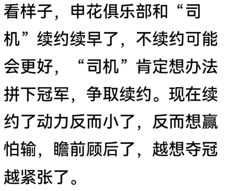 但你想过没有,在申花领先6分之际,顺风顺水的司机似乎更能呼风唤雨,俱乐部生怕别人挖墙脚,早早与之续约。蓝迷一阵欢呼,其他队教练和球员好生羡慕。