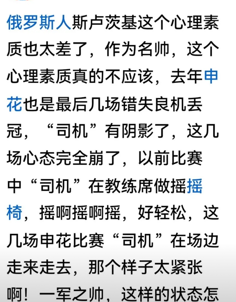 有球迷质疑斯卢茨基总在场边来回疾步,溢于言表释放情绪,干扰球员比赛的专注;赛后还要死要活,又影响队员闭门思过的情绪;进而怀疑申花与之续约早了,让其保守有余拼劲不足。