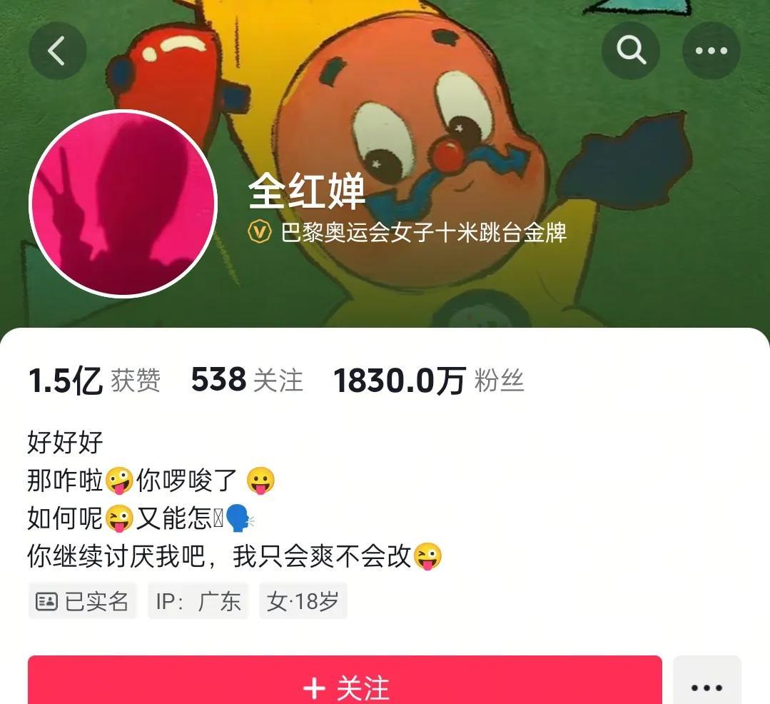 全红婵抖音坐拥1800万粉丝, 却只喜欢在只有几千粉丝的外网更新日常, 在那里,她可以自由地做自己, 也得以避开刺耳的声音。 虽然她嘴上说着 “你就继续讨厌我吧,我只会爽不会改。” 看似洒脱, 但其实她也害怕那些铺天盖地的舆论压力。 说到底,大家对她的审视太严苛了, 可谁让她是天才少女呢?